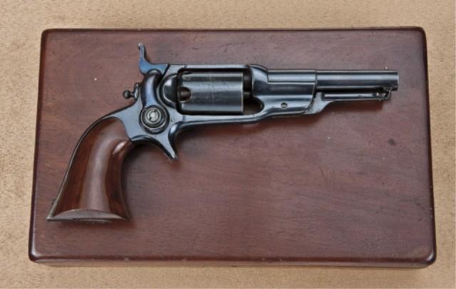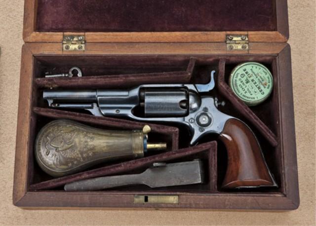 Colt model 1855 Root, .31 caliber percussion revolver, 3-1/2” barrel, serial #12061, with screw in cylinder, model 7. Cased with accessories. Refer Flayderman 5B-072. The pistol remains in very good to near to fine original condition showing 80-90% original blue, slight drifting to plum, some lightening at the edges, good sharp barrel address. Cylinder scene remains about 10-20% and were very light on these late production arms as the roll was worn. The varnish wood grips are very good plus and show excellent refinishing and are slightly down from the backstrap on the metal. The pistol is contained within its original to the period partition style velveteen lined case. The interior of the case remains in good to very good condition with some minor compressions, discolorations, slight areas of wear, but at least very good overall. The eagle flask is of the correct style and shows 50% varnish. The iron .31 caliber mold is very good with 50% toning blue. An original key is retained. The exterior of the box is very good with some minor scratches, storage marks, etc. A good gun in a very good box. Est: $3,500 - $7,000