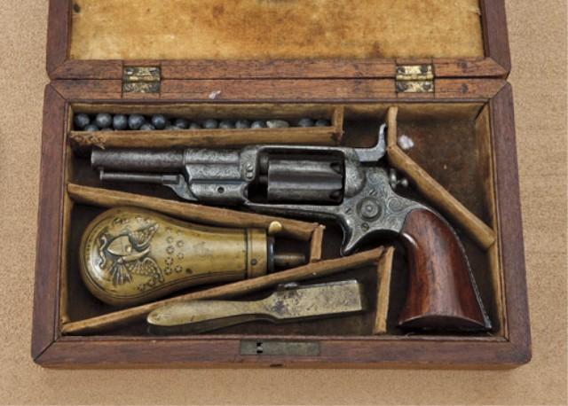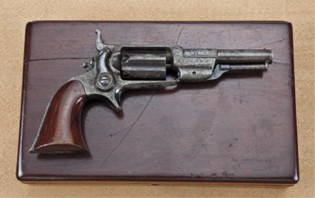 Colt model 1855 Root Revolver, Fifth variation, .31 caliber percussion, fluted cylinder, period scroll engraved through blue, period standard wood grips, serial #5567. The pistol is contained in an original to the period velveteen lined percussion case with accessories. The revolver shows 20-30% original blue drifting to brown, good barrel address and patent markings. The grips show some small losses at the rear, some edge wear, and about 40% varnish and would be very good except for the losses, so we rate them as good. There is some bright blue in protected areas. The action is not quite working. The engraving is hand cut and 19th century in style and execution, but not a known or identifiable engraver. The origi to the period case is in fair condition showing a broken partition that needs rebluing, some fading and fraying and is fair to good and would improve with careful restorations. An eagle flask in fair condition is retained and a .31 caliber brass Root mold in fair to good condition is also included. The exterior of the case is good with some small nicks, mars, a couple of age cracks, but generally good. Est: $2,000 - $4,000