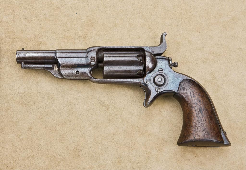 Colt model 1855 Root model 5, .31 caliber percussion, fluted cylinder, unusual 3-1/4” barrel, blued finish, wood grips, serial number “3773”. The revolver shows approx. 20-40% original blue drifting to brown with some scattered light to moderate erosion and surface pitting and some slightly heavier pitting on the right side of barrel and lug. Patent dates are sharp on the cylinder. The grips show some losses at the heel, and a couple of large chips missing, and are only fair overall. The grip screw and butt are missing, the marking are sharp, the action is good, and generally good to very good overall. Purchased 4/10/1940 from Charles DuPont from Theodore Bucklew of Wilmington, Delaware, who was a close associate or inlaw of the DuPont family. With inventory sheet from the Charles DuPont collection. Est: $900 - $1,800