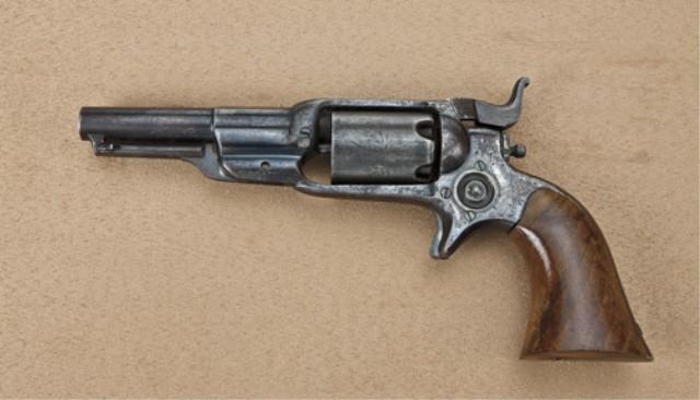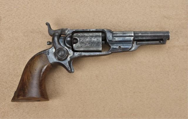 Colt model 1855 Root model revolver, .31 caliber percussion, 3-1/2” round barrel, blue finish, varnish wood grips, two-line New York address, serial #10949. Variation 6, Refer Flayderman 5B-071. The Root remains in original good condition showing 30-50% original blue turning to plum brown, with some scattered erosion and pinprick pitting and some areas of heavy pitting on cylinder on top right side of frame. The front sight is missing, barrel address is slightly light and there are some marks around the cylinder pin and backstrap area from disassembly. The varnish wood grips are good and show normal aging, there are some screws replaced. Action good, bore good. Est: $700 - $1,400