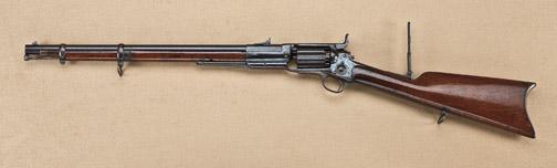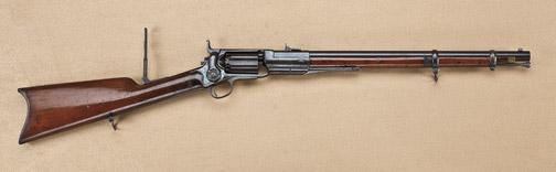 Colt model 1855 Root sporting rifle, .44 caliber percussion, 21-1/8” barrel, blued finish, varnish walnut stock, with rare folding tang peep sight, serial #599 and showing unusual cylinder latch screw mounted on the left side of the frame. Pictured in The Book of Colt Firearms by Sutherland and Wilson, page 192. The carbine shows approx. 75-85% original blue finish, some erosion and pitting mostly on the cylinder, rear of breech, top of frame, and firing areas. The Colt markings on top of frame are good and visible. Most of patent date on 6-shot cylinder is visible. There is some scattered areas of bright blue. The varnish wood stocks are very good with some small losses by the rammer, some dings, mars, scratche mostly on the forend. The buttstock is considerably better with just some minor scratches, minor marks. The action is working, but not perfectly. An original to the period ramrod is retained and a original 3-leaf rear sight and high rise front sight and front barrel dovetail. A significant variation with good provenance as being pictured in the key Colt book. Purchased from noted firearms dealer Alan S. Kelley, 1979, with original receipt and advertisement. Mr.
