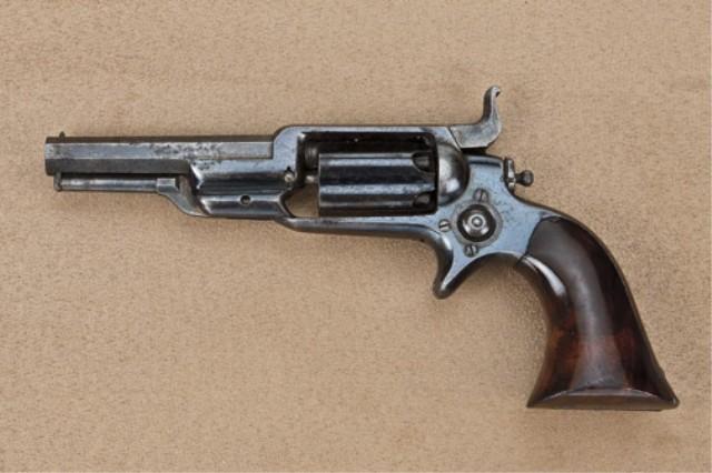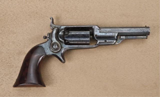 Colt model 1855 Root, third variation, .28 caliber percussion revolver, 3-1/2” octagon barrel, full fluted cylinder, serial #17827. Refer Flayderman 5B-066. The Colt remains in very good plus original condition showing 40-60% original bright blue going to brown patina with some scattered light to moderate pitting and erosion. Most of the aging on top of barrel and left front of frame. The markings are good, the edges are sharp. Patent dates on cylinder very legible. The hammer and loading lever show strong traces of case hardening. The varnish wood grips are at least very good with 70% varnish, some minor marks at edges and a nice burl grain. The action is in need of adjustment as the cylinder pin kicks out. There are some minor marks on the end of the cylinder pin and rear of frame. A good example. Est: $800 - $1,600