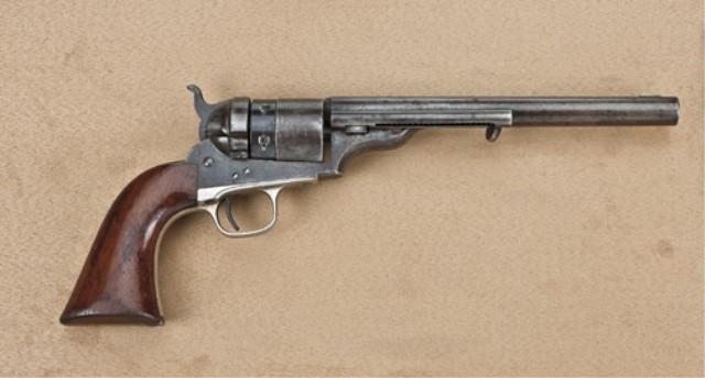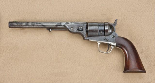 Colt model 1860 Army Richards Mason conversion, .44 centerfire, 8” barrel, shows smaller barrel lug similar to ’72 opentop. Short Colt’s patent cartridge-era address. 1871/72 patent dates. .44 caliber stamped on left rear of trigger guard. Traces of blue and case hardened finish. Serial #6047. One of approx. 2,100 produced in the cartridge era. Refer Flayderman 5B-020. The revolver remains on good to very good original condition showing 10-20% original blue on barrel and cylinder, mostly in protected areas and drifting to a grayish brown patina, some heavier pitting, blood type, at rear area top of barrel, slightly larger than a thumb print and a couple other areas thumbprint size on left side of barrel. The front sight has been slimmed slightly, the barrel address is good. The cylinder shows 60-70% original scene with light engagement dates at edge. The frame shows 30-50% finish darkening to a grayish brown patina with feint colors. The trigger guard show 80-90% original silver plate. The backstrap shows 10-20% dulling original blue. The varnish wood grips are good to very good with 50-70% varnish, some wear at the edge, small scratches, minor imperfections, small losses at