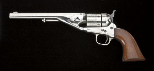 Colt model 1861 Navy Richards-Mason Conversion to .38 rimfire caliber. Original nickel finish, varnish wood grips, serial #96. The revolver remains in fine to excellent original condition showing 90-95%bright original nickel. Some minor losses, slight beginning age, and miniscule pinprick pitting where finish has lifted. The cylinder scene is nearly 100% intact. The markings are razor sharp, the edges are crisp. Thehammer shows bright blue on the firing pin, and most original case hardening. The trigger shows most of its original blue. The varnish wood grips are fine to near excellent with at least 95% original varnish, just someminor marks and edge wear. All matching serial numbers, crisp action, pristine interior. One of about 2,200 of this model produced as a cartridge arm. A strong 9.7 on a 1-10 scale. Would be difficult to improveupon. Est: $7,500 - $15,000
