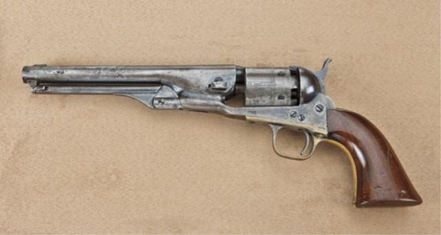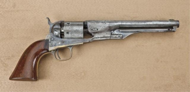 Colt model 1861 Navy revolver, .36 caliber percussion, blue and case hardened finish, varnish wood grips, serial #10985. The barrel shows 5-10% original blue drifting to an even grey-brown patina, some scattered light to moderate erosion and pinprick pitting, and light cleaning long ago. The cylinder shows 60-70% original scene, some minor pitting, wear at the edges. The frame, hammer, and loading lever show 30-40% case hardening with some areas of rainbow colors where protected. The backstrap and trigger guard show 30-40% darkened silver plate. The varnish wood grips are very good plus with 75-85% original varnish. Some scratches, wear at the edges, normal aging. All matching visible numbers, tight action, bright bore. The underside of the barrel beneath the loading lever shows bright original blue. An above average 61 Navy with a nice appearance that saw honest use. Est: $1,750 - $3,500