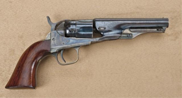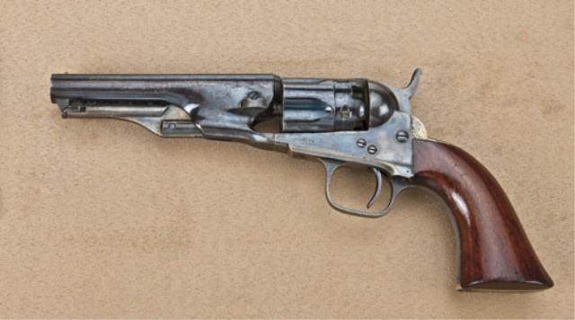 Colt model 1862 Police, .36 caliber percussion, 4-1/2” barrel, blue and case hardened finish, varnish wood grips, New York address serial #2586. The revolver remains in very good plus to near fine original condition showing 50-70% original blue on barrel evenly flaking and toning to a light brown patina with some minor scratches and a couple of mars in the wedge port area. The address is sharp, the cylinder retains 75% plus bright original blue with sharp patent date. The frame shows 70-80% case hardening with some areas of strong rainbow hues drifting at the edges. Hammer shows 50% darkening case hardening. The rammer shows 30-50% case hardening drifting to patina. The backstrap and trigger guard show 40-60% darkening original silver plate. The varnish wood grips show 80-90% varnish with some slight wear at the bottom edges, minor handling, but are generally near excellent. The action is crisp, the bore is bright and shiny and shows little use. All matching visible serial numbers. A crisp ’62. Est: $1,500 - $3,000