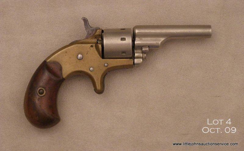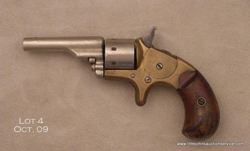 Colt model 1872 open-top 22 cal. S.A. revolver, nickle-plated serial #27315. The Colt shows an old re-nickled finish w/brass patina on frame, fair to good grips, front sight missing, action not quite working. Matching #'s. early production about 1874 or 75. A favorite pocket pistol in the old West. Fair to good condition. Est. $150 - $300.