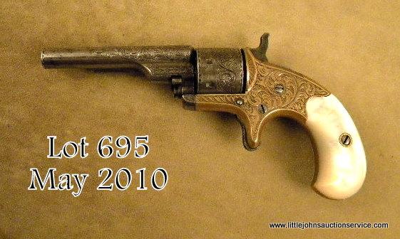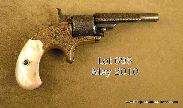 Colt model 1872 open top .22 caliber revolver, early production, with 2-7/8" barrel and ejector rod fully and finely New York engraved in Nimschke style, silver and gold plated, pearl grips,serial #766. This early Colt shows original and well executed Nimschke style scrolls that are very profuse and well accomplished. The barrel and cylinder show strong traces of silver going to grey metal that are completely unpolished withgood sharp edges. The frame shows light gold gilt in protected areas drifting to uncleaned brass patina. The grips are fat and original, the left grip is very good to near fine, the right grip shows a crack through the center and is otherwisegood. The front sight and ejector rod are missing. A very rare Colt to find profusely engraved and this specimen is deserving of minor restorations it needs. Est: $2,500 - $5,000