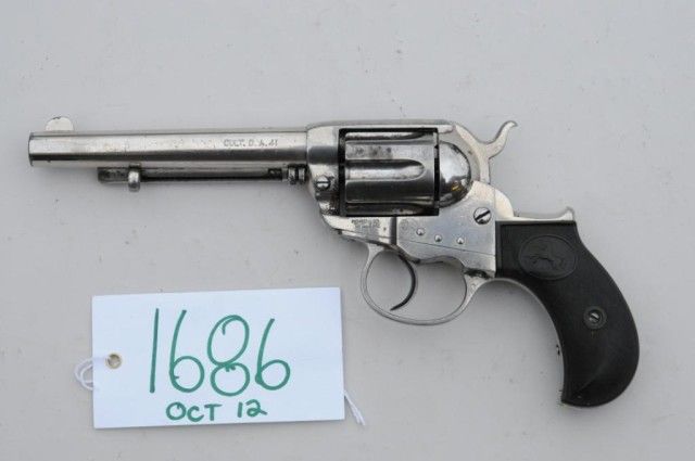 Colt model 1877 Thunderer of .41 caliber with 5” barrel, nickel plated, hard rubber grips. Serial #83618. Very good condition with 75% to 85% original nickel with some light old cleaning. The markings are good and gripsvery good and still crisp. Action not quite working. All matching with bright bore. 1880’s period of Mfg. Est.; $700-$1,400
