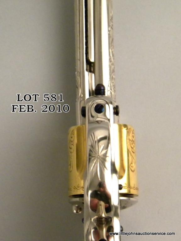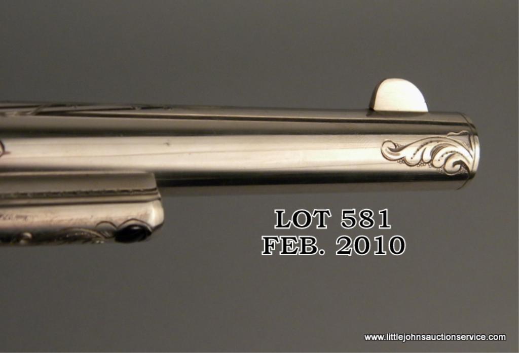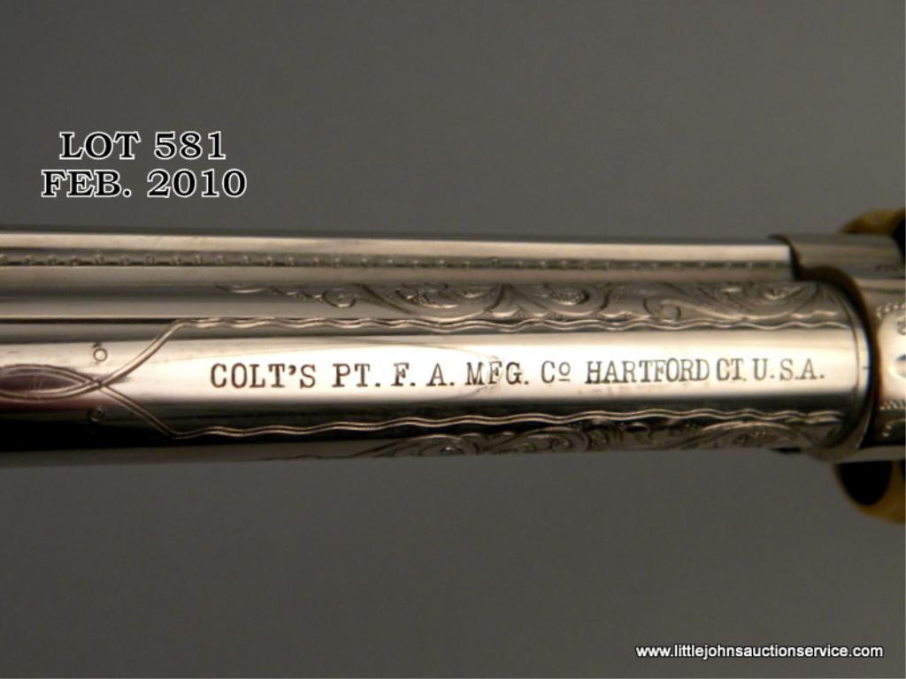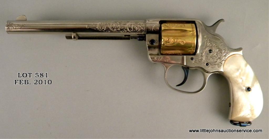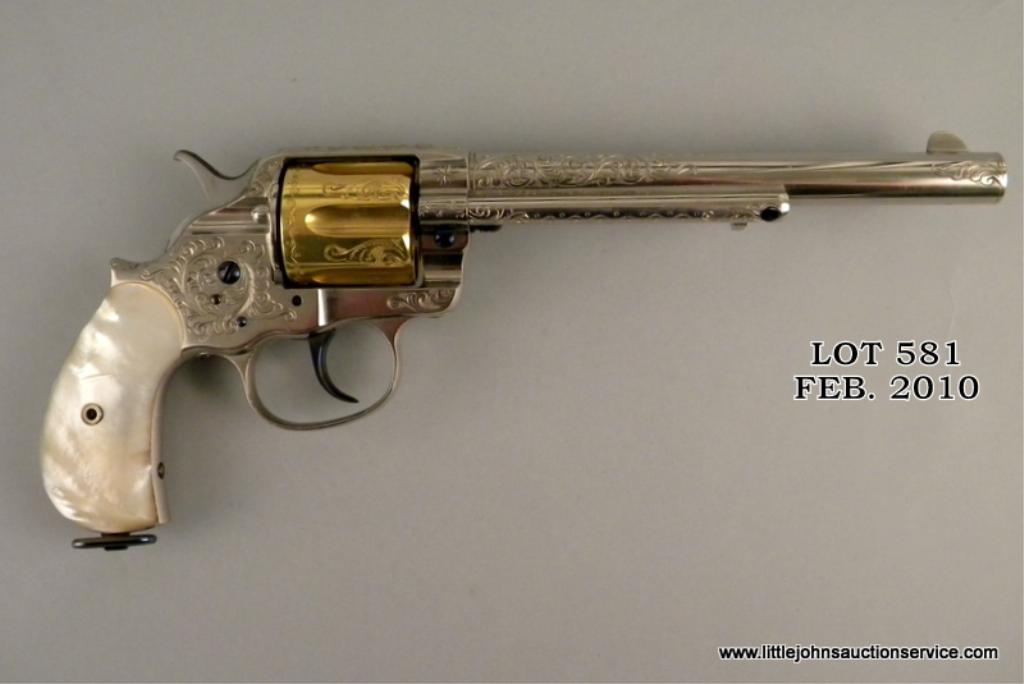 Colt model 1878 double-action frontier revolver in .45 long colt caliber, 7-1/2" barrel, nickel and gold plated, New York style scroll engrave with original to the period pearl grips, #2975, made about 1879. The pistol has been nicely restored and refinished with 100% of the nickel, gold, and fire blue trip retained. The engraving is Nimschke in style but has been re-cut or sharpened and we have not verified at factory. Markings good, action good. Very attractive and "showy" with great original period pearl grips and early "fat" straps. Est: $2,000 - $4,000