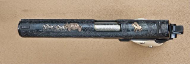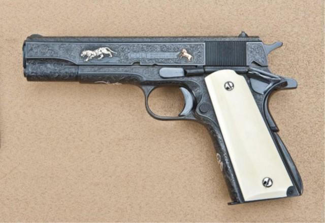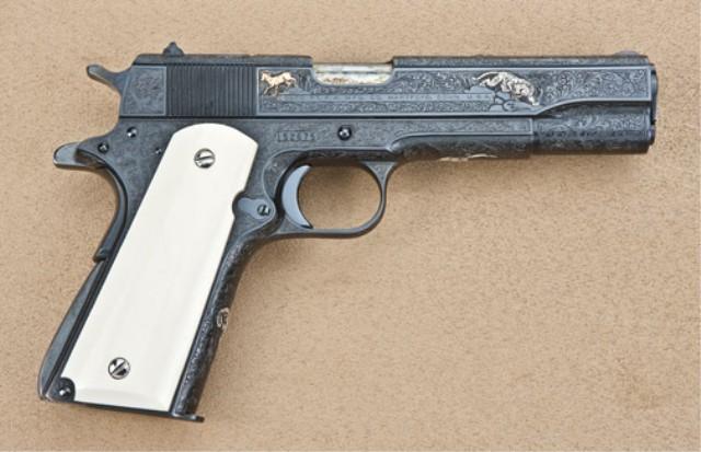 Colt model 1911A1 .38 super, semi-automatic pistol, serial #152675. Finely engraved gold and silver inlaid in classic American big game and western scenes, blued finish, smooth ivory grips. The Colt shows a horse drawn stagecoach on top forward of barrel in gold and silver, raised relief inlays. The rear of the slide shows a Western scout on horseback. The left front of slide shows a mountain lion or cougar in high relief or sterling inlay with Colt horse logo behind .38 super automatic legend or address. The bottom front of frame shows a silver antelope in high relief. The instrap shows a big horn sheep at center portion in high relief silver. The right rear of slide shows a gold-inlaid fawn in high relief. The forward of slide shows a bobcat stalking this fawn. The relief inlays are surrounded by well-executed foliate scrolls which are D+ in coverage. The pistol itself is a combination of prewar and postwar .38 super parts. The barrel, bushing, small parts, are all postwar, the frame is prewar. The pistol retains approx. 98-99% deep blued finish restored at time of embellishment. The interior is fine to excellent and shows little use. The ivory grips