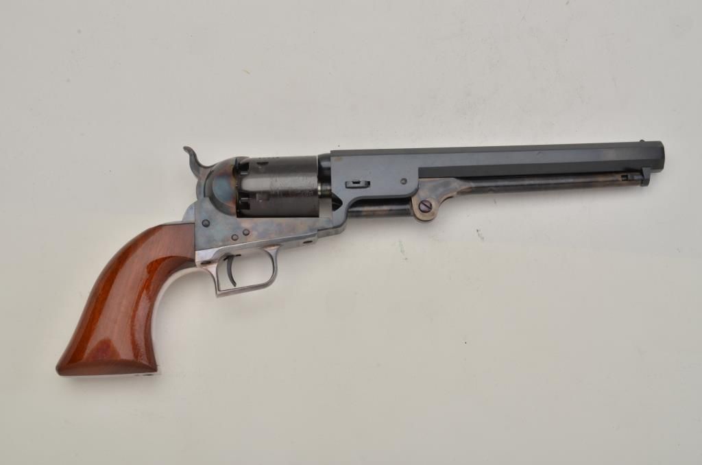 Colt new Blackpowder Series percussion Model 1851 Navy revolver, .36 cal., 7-1/2” octagon barrel, blue and case hardened finish, wood grips, #27608 in factory lined wood box with brass powder flask, brass bullet mold, leadballs and instructions manual. This gun is in like new condition showing little handling; case is in overall fine condition. Est.: $500-$1,000.