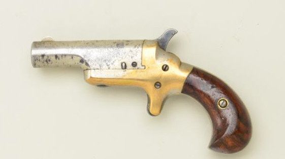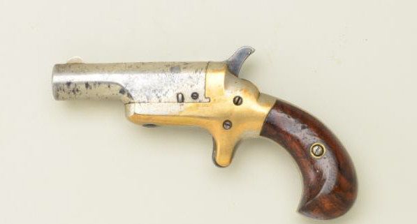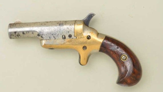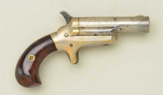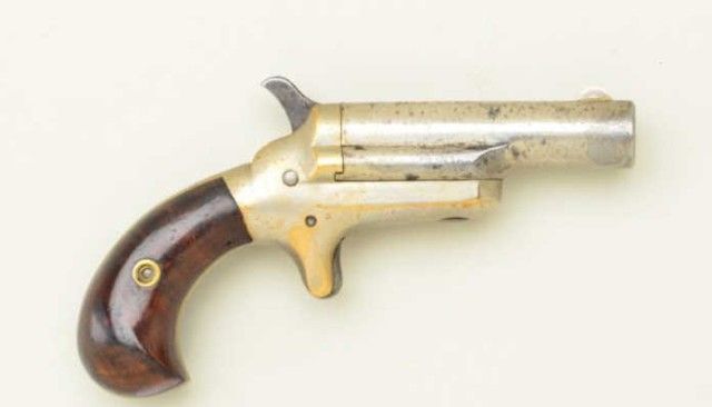 Colt, no. 3, .41 caliber derringer nickel plated with grips. Serial #7972. The pistol shows a unclean patina with approximately 30%-40% original nickel, some minor pitting and erosion where finish has lifted. Thebrass show and unpolished patina where exposed. The grips are good with 50%-60% varnish, some storage marks, bumps and minor compressions. The caliber and barrel address are sharp and the breech shows no marks fromimproper closing. The action locks tight and bore is fair. Est.; $300-$600