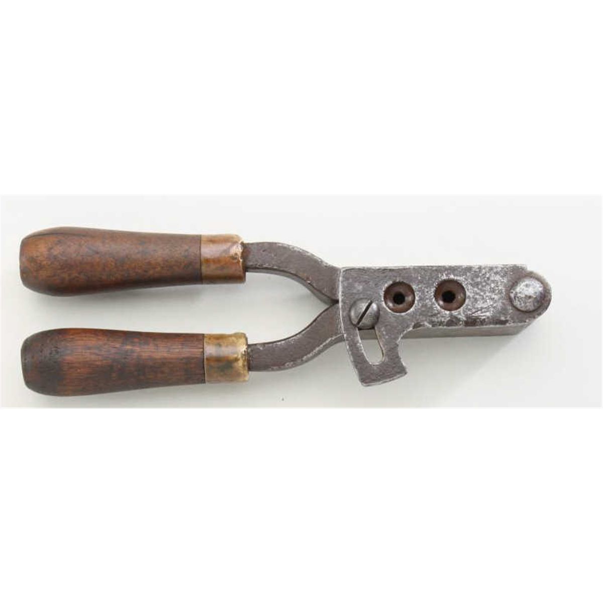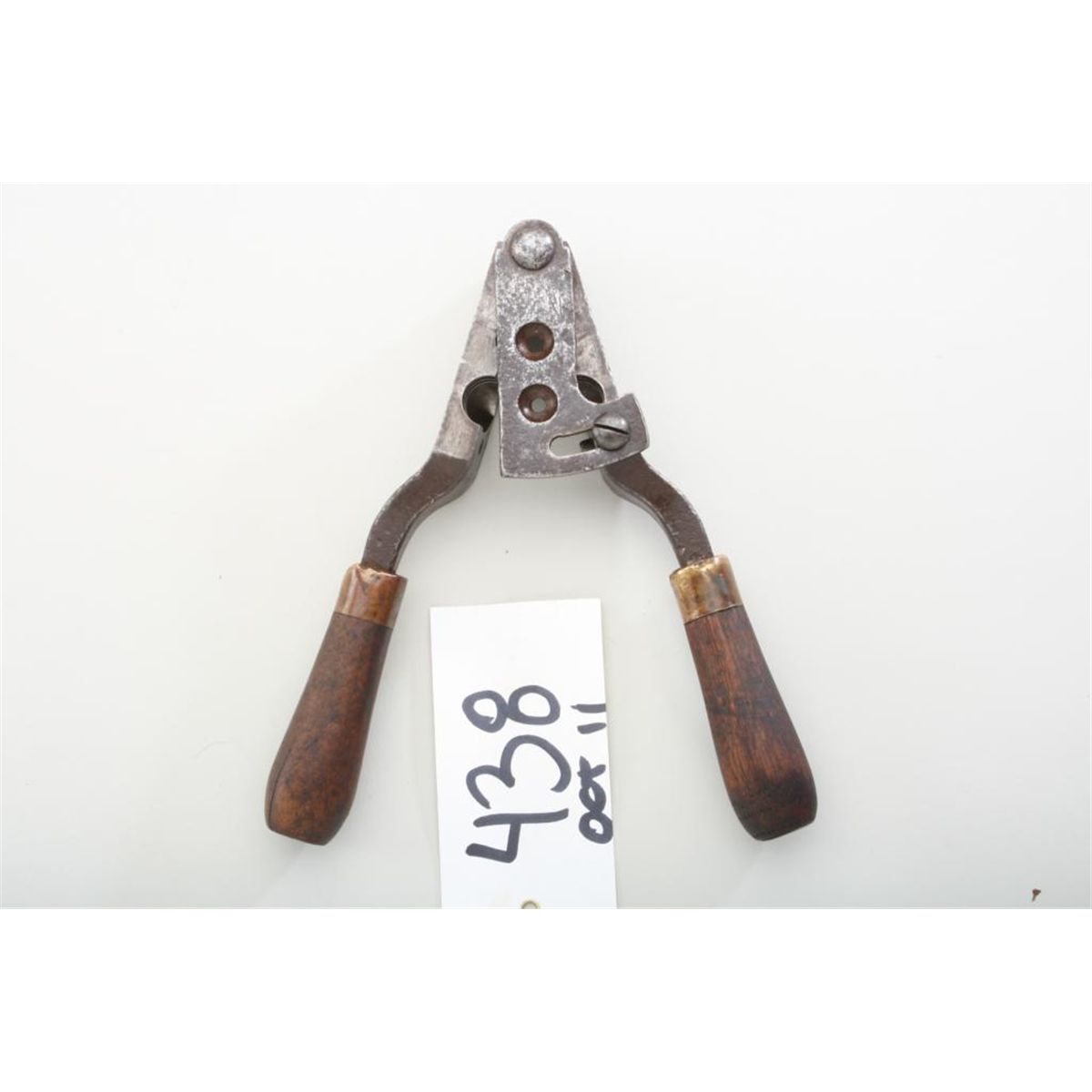 Colt patent two-cavity bullet mold, .64 caliber, for conical and ball shaped bullets. Patina finish, wood grips, brass ferrules. The condition is fair to good, some heavy rusting and pitting. Cavities are good.Colt’s patent on sprue cutter barely visible. Grips good. One of only two known in this caliber. From the Keith Coulter collection. Est: $600 - $1,200