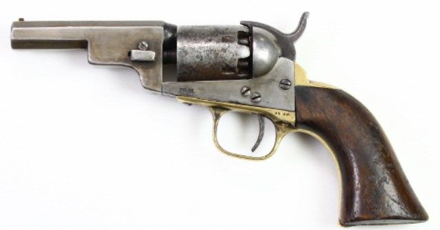 revolver in 1848 serial range, oval trigger guard of 1849, shortened barrel 3 1/4" without loading lever and marked address SAM COLT NEW YORK CITY. All serial numbers matching including arbor and cylinder, fame and barrel show smooth cleaned silvery gray finish, address sharp, cylinder with partially visible scene, moderate pin prick pitting, walnut grips good, average dings and mars, one backstrap screw missing. Revolver is complete with good functioning action and appears to be an early project gun. Antique. Est. 350-700