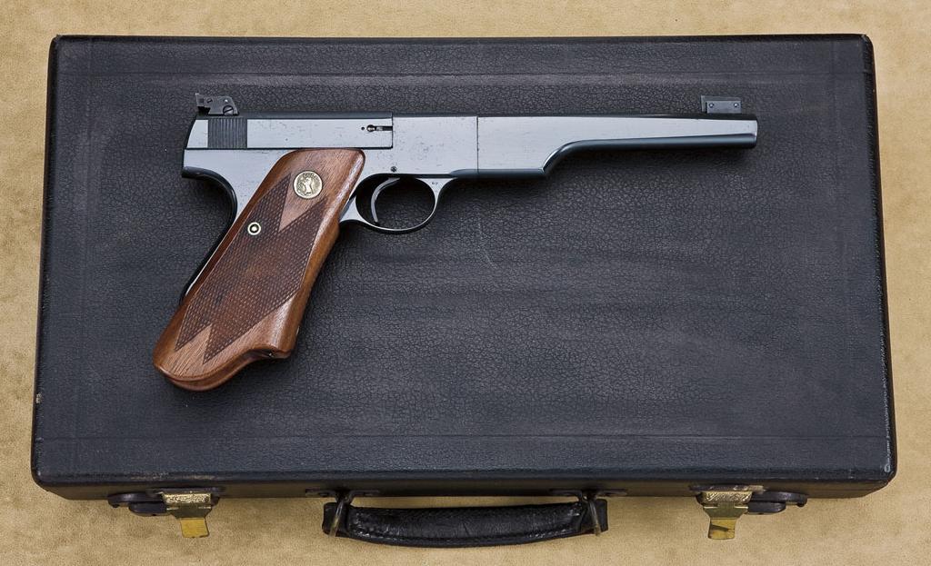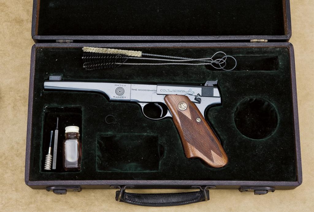 Colt prewar match target Woodsman, .22 semi-automatic pistol with desirable Roper-type medallion grips in period deluxe carrying case, serial #MT12043. The pistol remains in fine to excellent original condition with 98-99% original blue, some slight losses at edges and muzzle, a few minor scratches, but generally excellent overall with fine to excellent grips, some slight handling, minor shooting and use with bright and excellent bore. Correct match target marked Colt magazine. With shooting instructions and original target serial numbered to match. The pistol is contained within and original to the period green velvet lined case that is fitted in the French style and is similar to other luggage type cases pictured in The Book of Colt Firearms by Sutherland and Wilson. These cases were not factory made but were period and dealer supplied. The case remains in very good plus original condition. Est: $1,750 - $3,500