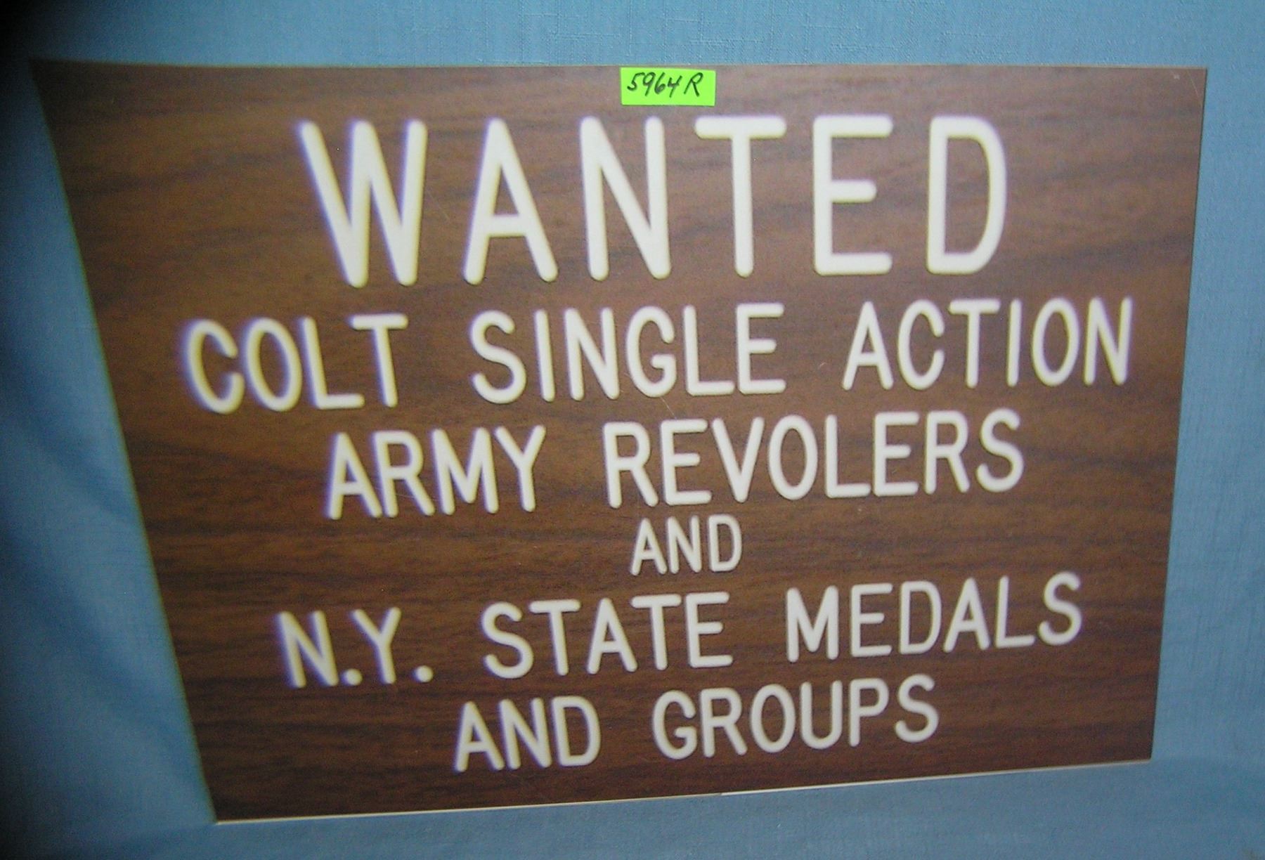 Wanted Colt single action Army revolver and NY state medals retro style advertising sign est. value $50.00-$65.00