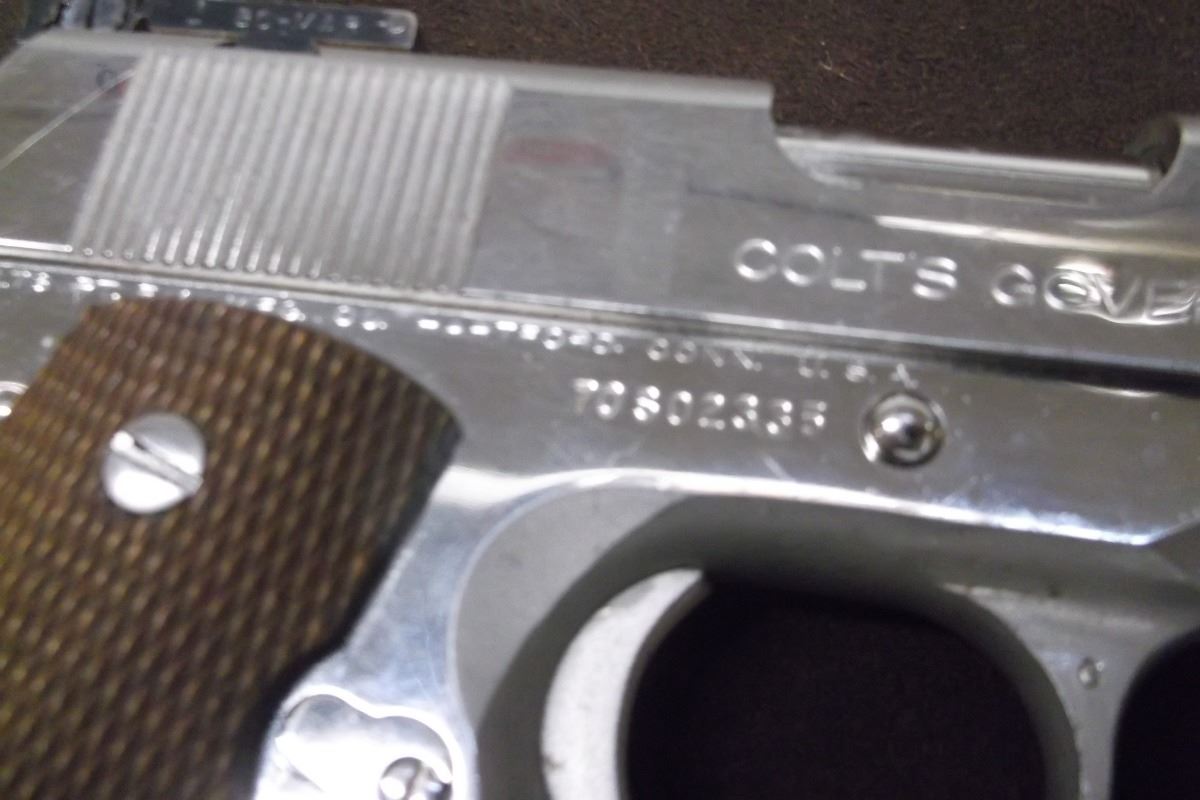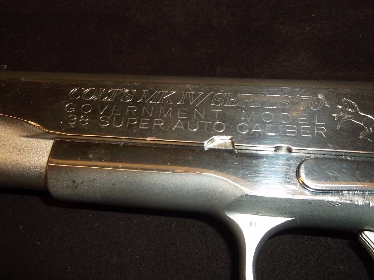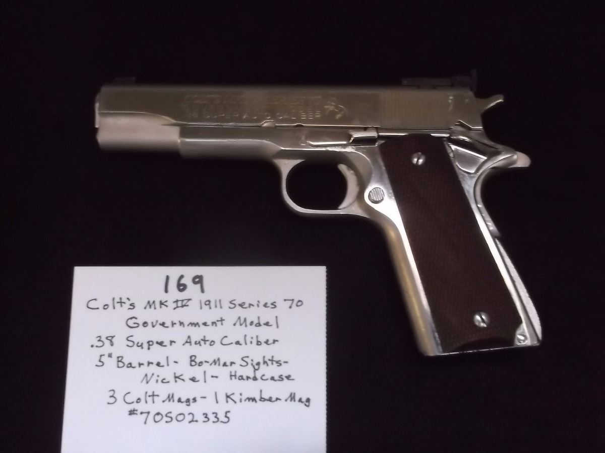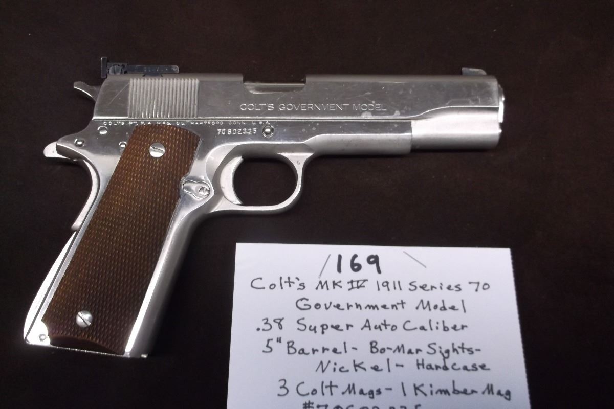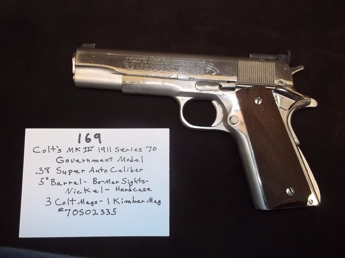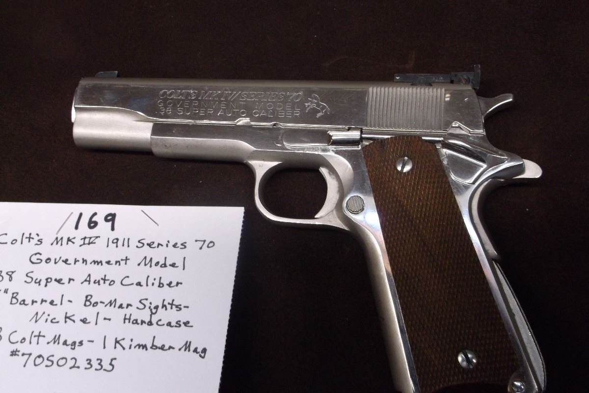 Colt's MK IV 1911 Series 70- Government Model- .38 Super Auto Caliber- 5" Barrel- Bo-Mar Sights- Nickel- 3 Colt Mags- 1 Kimber Mag- Hard Case- #70S02335