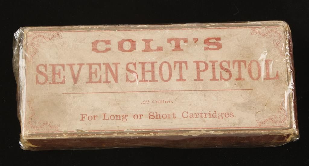 For open top seven shot revolver. Box is marked "Colt's Seven shot Pistol .22 Caliber For long or Short Cartridges" wrapped in plastic in good condition.