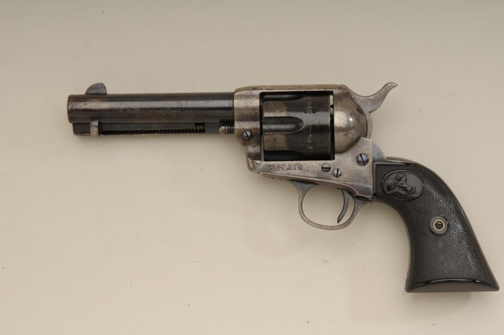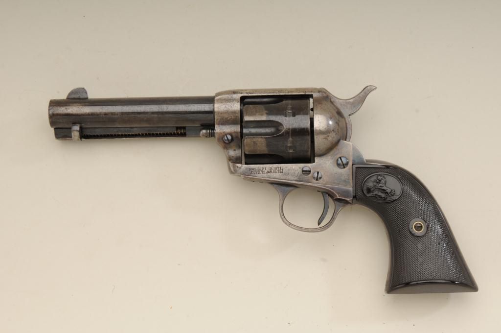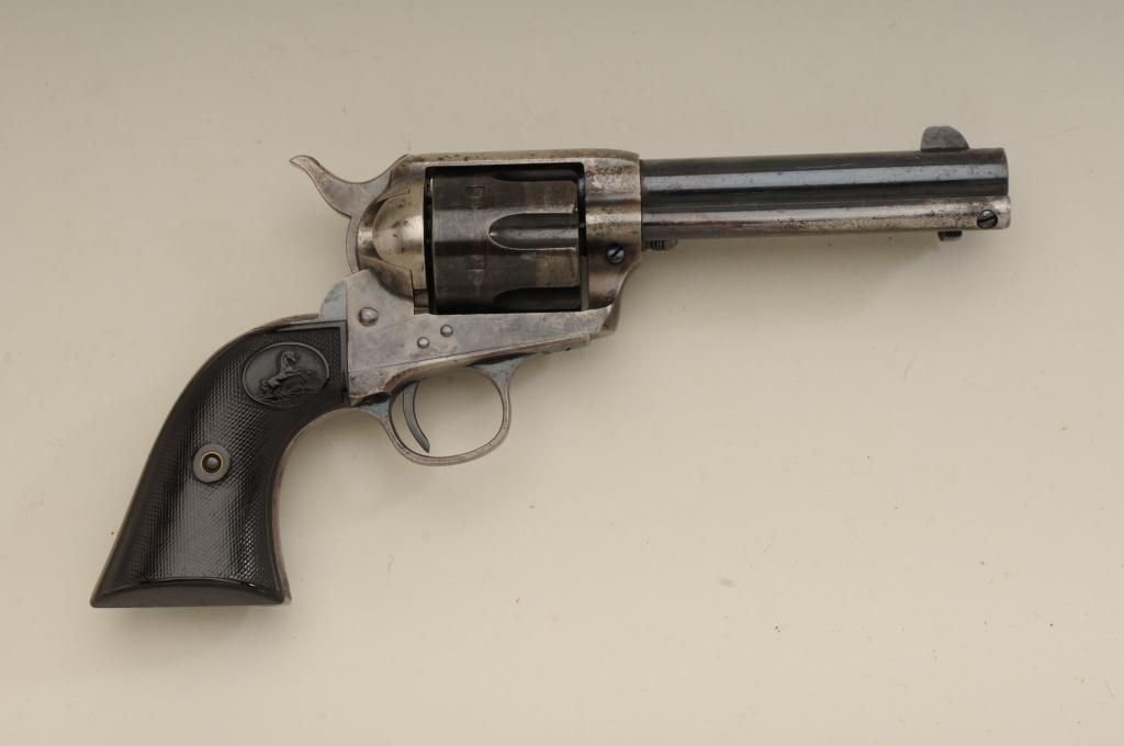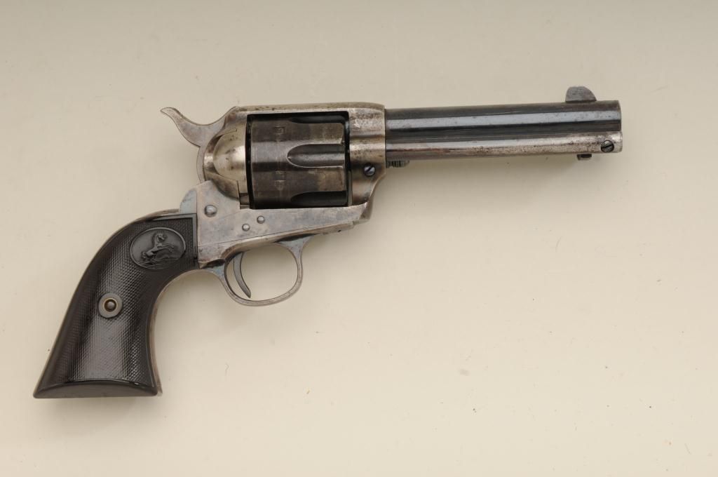 Colt single action Army revolver .44 – .40 caliber, 4 ¾ inch barrel, with considerable blue and case hardened finish remaining. Serial number 197302. This Colt remains in original very good condition with good sharpedges and good markings. Approximately 30% to 50% original blue remains with good sharp original grips. A nice frontier caliber Colt. Est.: $2,750-$5,500.