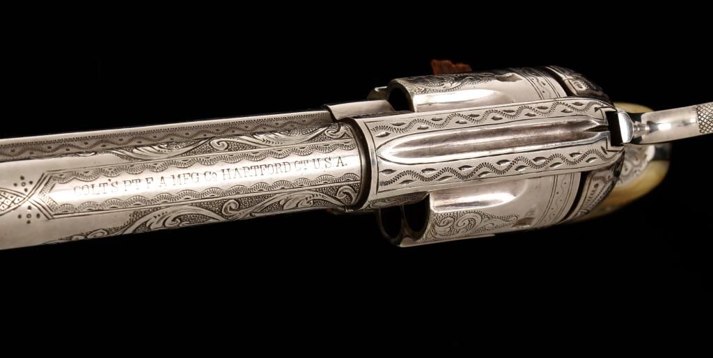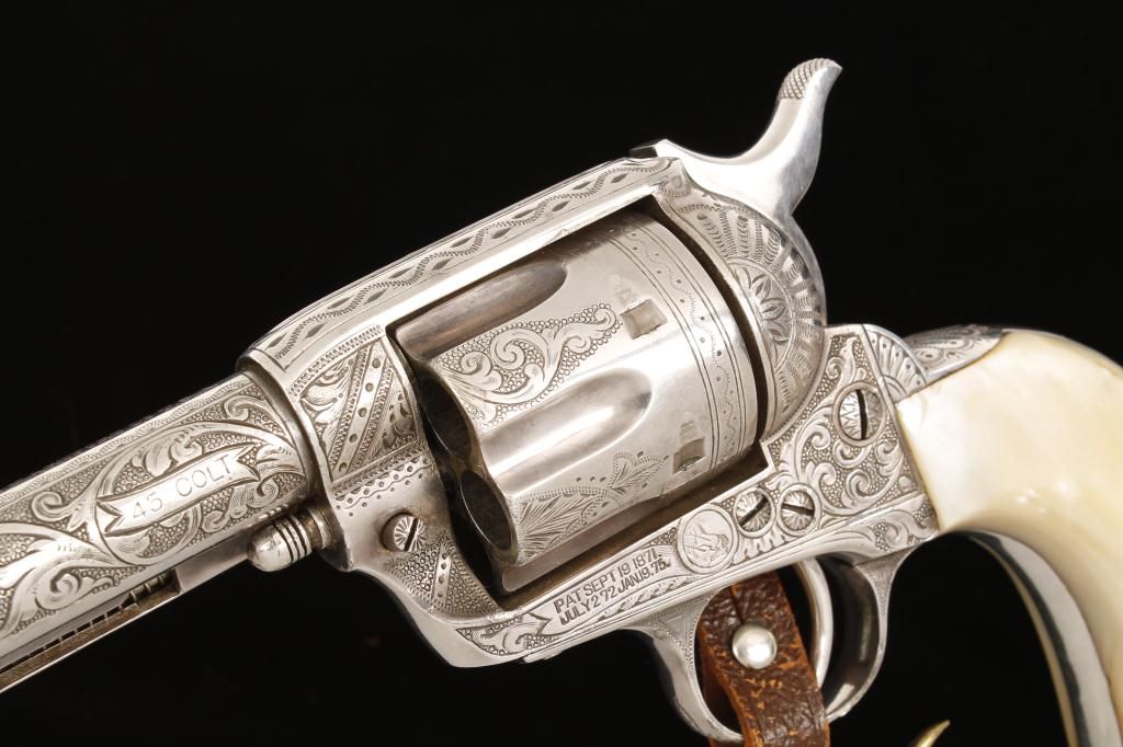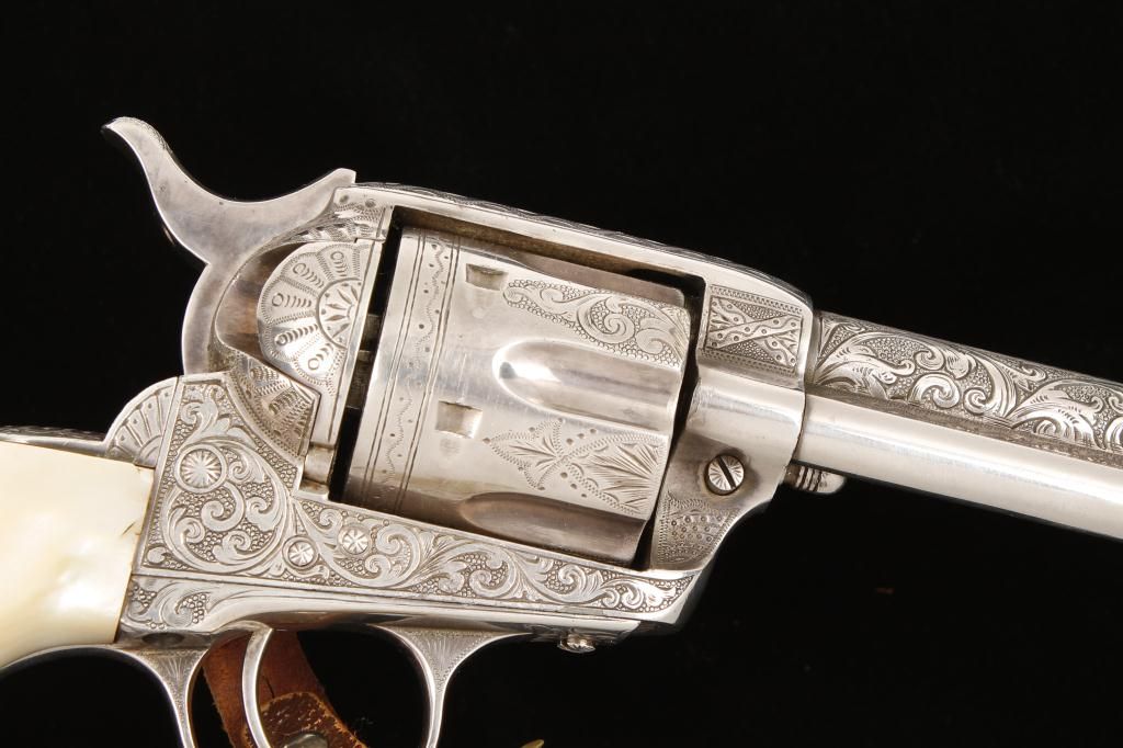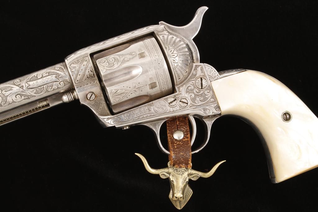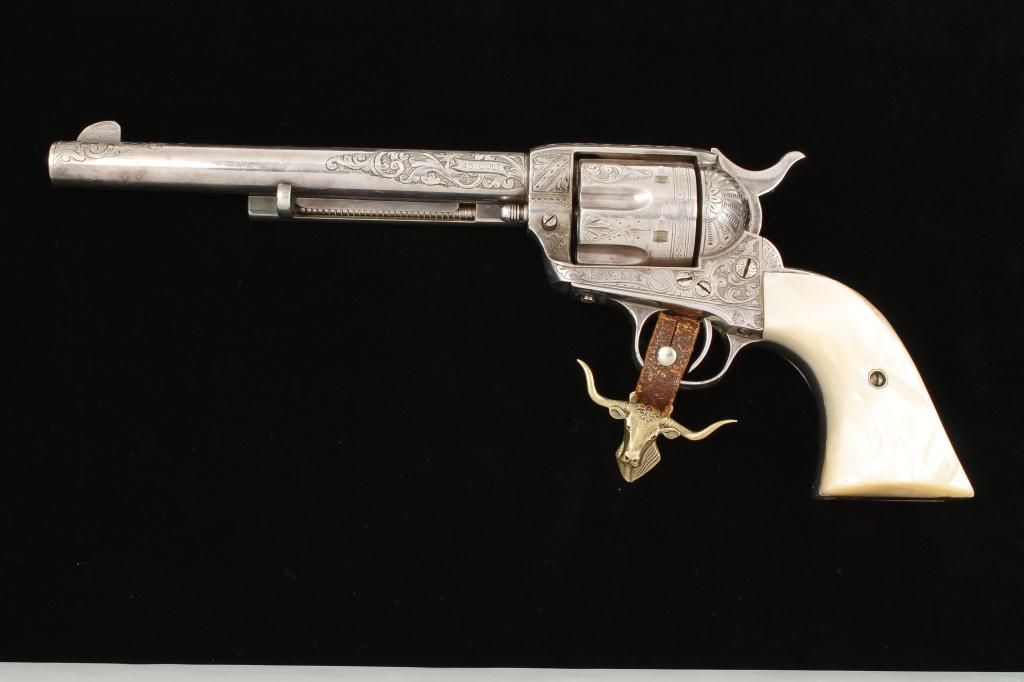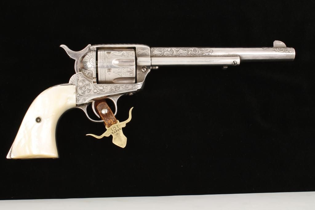 Colt single action Army revolver in . 45 long Colt calibers with 7 ½ inch barrel, factory engraved, re-silvered finish, pearl grips, inscribed on back strap, “1916, from Be Ho Gray to George Hubert” in period script,serial number 317105. Factory letter confirms engraving, grips, caliber, barrel length, and lists the original finish as nickel with address of shipment Von Lengerke and Anton, Chicago Illinois. Shipped on March 30, 1911,with one (1) gun in shipment. This single action is illustrated and described in an article for the Rampant Colt magazine in the summer of 2007 by John Pfeifer and now consigned by his estate. The article mentions the creation of the 101 Ranch show in Oklahoma and recants that the Miller brothers were close friends with Bee Ho Gray, George Hubert, Tom Mix, Ken Maynard and other Western notables. He notes that Bee Ho means“brother of the cripple” in the Comanche language and indeed Gray’s brother was handicapped. He further documents that in 1916 the Millers were forced to sell the 101 Ranch and the performers went their separate