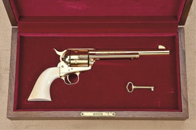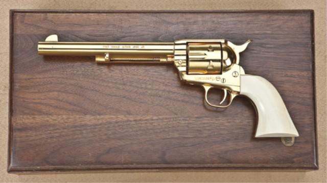 Colt single action army revolver, .45 caliber, 7-1/2” barrel, full gold plated, one-piece screwless ivory grips, backstrap engraved “Gunsmoke” serial #3 in the series, factory #63043SA in custom workshop display box. The revolver shows a fast-draw or offset hammer and shows no evidence of firing or use. Right side of barrel is marked Arvo Ojala commemorative. Only a limited number of these were produced for Arvo Ojala who’s deal with the factory somehow fell through. According to our consignor, less than 10 were made, and originals were priced more than 20 years ago at over $3,000. Est: $1,500 - $3,000