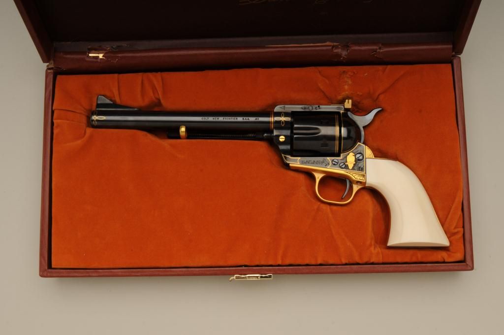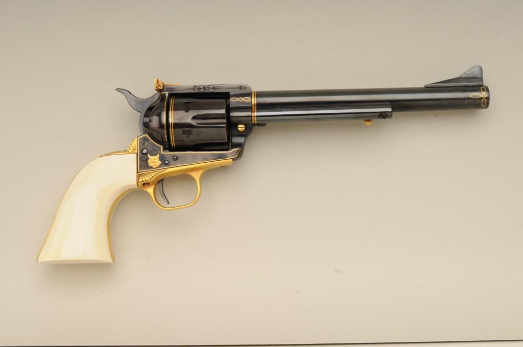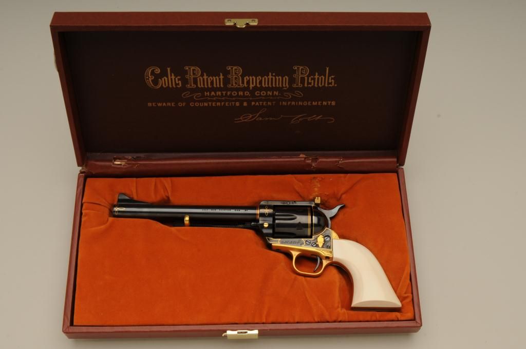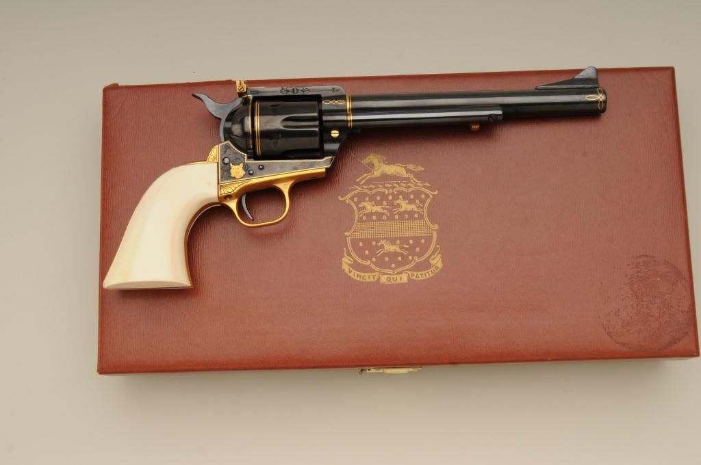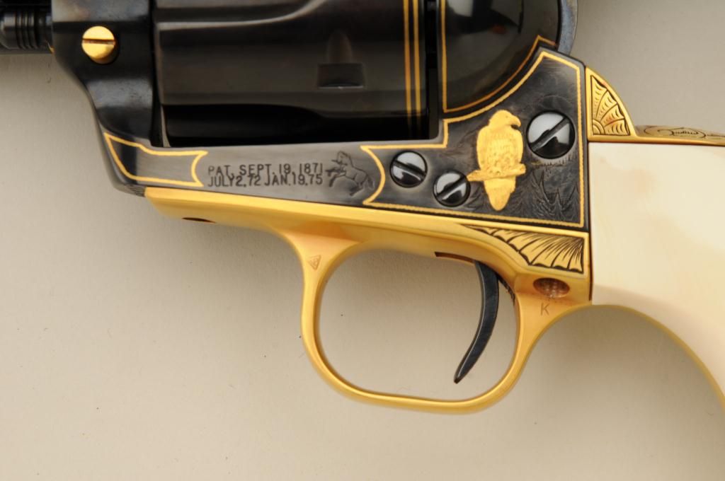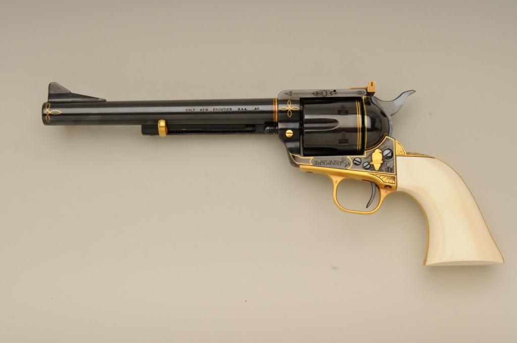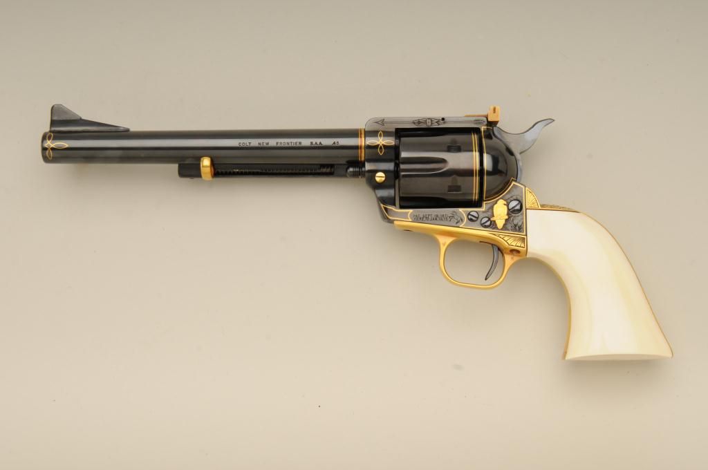 Colt single action army revolver, New Frontier series, .45 caliber, 7-1/2” barrel, engraved in flush-gold inlaid with gold plated straps and screwless ivory grips in Colt custom workshop case. Serial #03912NF.The pistol shows flush gold bands and borders on barrel. There is a portrait of an elk on top front of frame gold scroll borders, gold eagle by hammer screw with light background engraving showing pine trees and mountains.The right side of frame between the screws shows a roaring bobcat surrounded by engraved mountains and trees similar to left side. Each side of the top of the frame shows an arrow type of engraving. The straps arefloral engraved and gold plated. The pistol shows nicely made ivory grips. The condition is fine to excellent as refinished at time of engraving. We are not familiar with the hand of this engraver and it may have beensupplied through the Custom Gun Shop or possibly on custom order. Est: $2,000 - $4,000