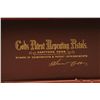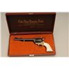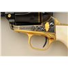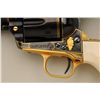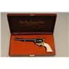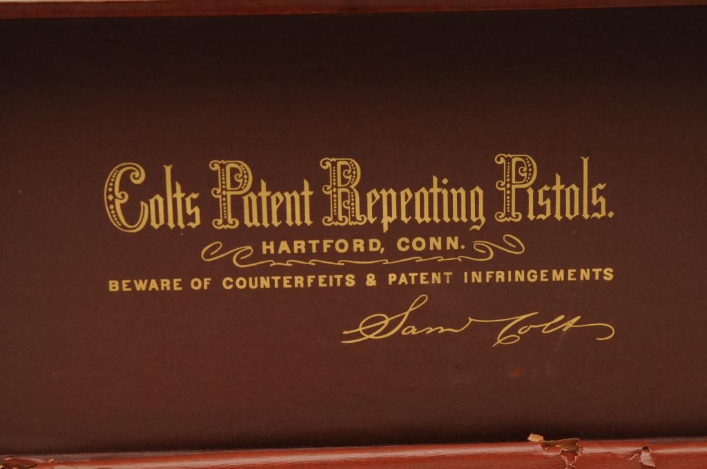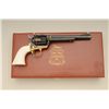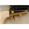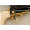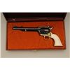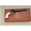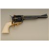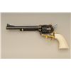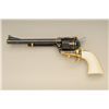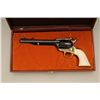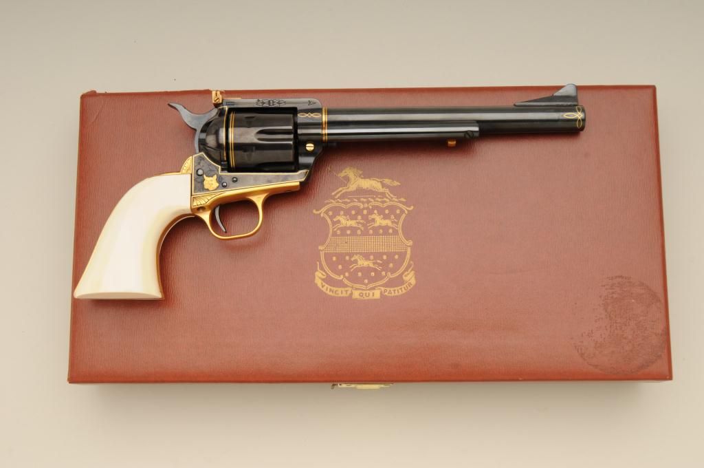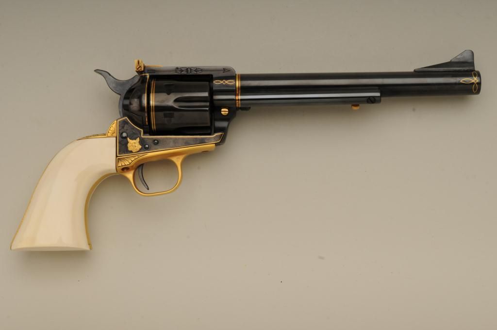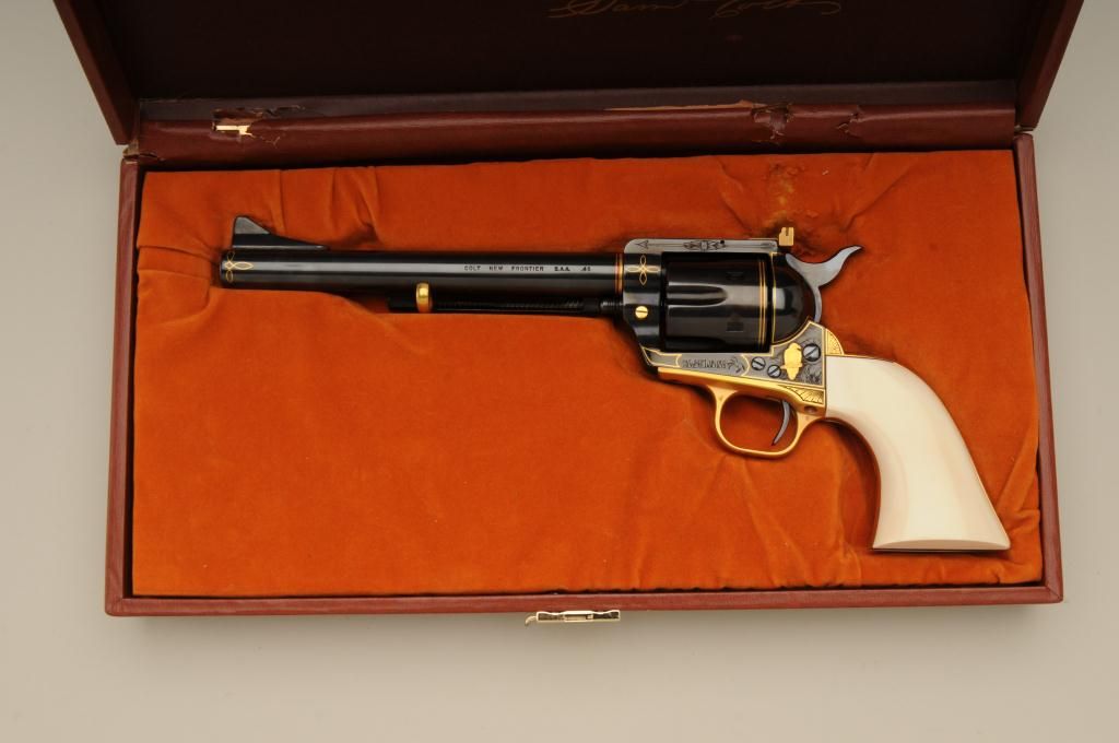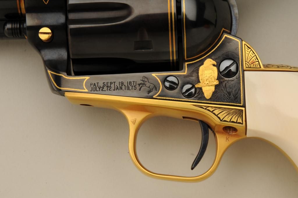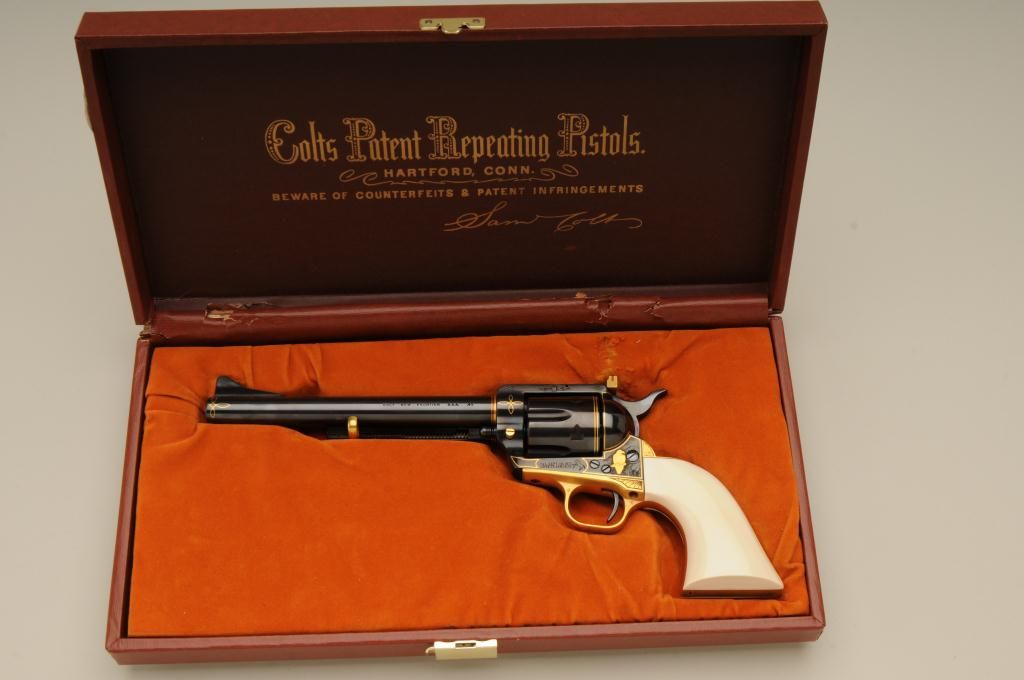 Colt single action army revolver, New Frontier series, .45 caliber, 7-1/2” barrel, engraved in flush-gold inlaid with gold plated straps and screwless ivory grips in Colt custom workshop case. Serial #03912NF.The pistol shows flush gold bands and borders on barrel. There is a portrait of an elk on top front of frame gold scroll borders, gold eagle by hammer screw with light background engraving showing pine trees and mountains.The right side of frame between the screws shows a roaring bobcat surrounded by engraved mountains and trees similar to left side. Each side of the top of the frame shows an arrow type of engraving. The straps arefloral engraved and gold plated. The pistol shows nicely made ivory grips. The condition is fine to excellent as refinished at time of engraving. We are not familiar with the hand of this engraver and it may have beensupplied through the Custom Gun Shop or possibly on custom order. Est: $2,000 - $4,000
