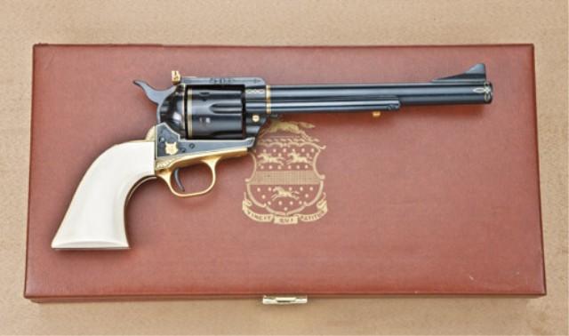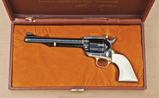 Colt single action army revolver, New Frontier series, .45 caliber, 7-1/2” barrel, engraved in flush-gold inlaid with gold plated straps and screwless ivory grips in Colt custom workshop case. Serial #03912NF. The pistol shows flush gold bands and borders on barrel. There is a portrait of an elk on top front of frame gold scroll borders, gold eagle by hammer screw with light background engraving showing pine trees and mountains. The right side of frame between the screws shows a roaring bobcat surrounded by engraved mountains and trees similar to left side. Each side of the top of the frame shows an arrow type of engraving. The straps are floral engraved and gold plated. The pistol shows nicely made ivory grips. The condition is fine to excellent as refinished at time of engraving. We are not familiar with the hand of this engraver and it may have been supplied through the Custom Gun Shop or possibly on custom order. From the Robert Petersen Collection. Est: $2,000 - $4,000