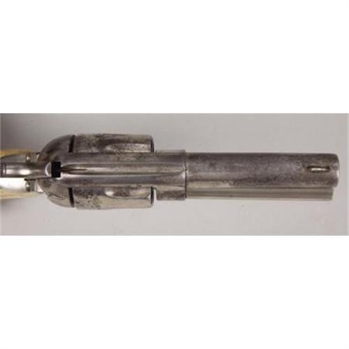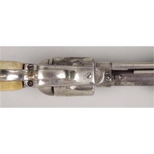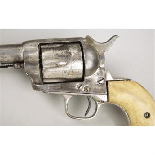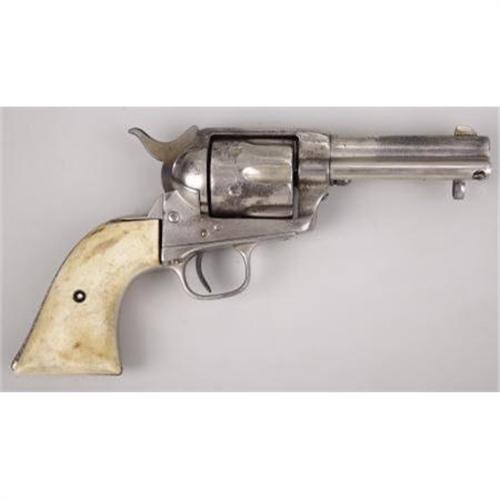 <B>COLT SINGLE ACTION ARMY REVOLVER</B></I> - Serial number 19753, circa 1875. 3 ¾” barrel in .45 calibre. All markings on revolver are as applied by factory. Functioning action with two piece stag grips. <BR><BR><B>Condition:</B></I> Original italic barrel cut to current length. Ejector housing replaced. Hammer from a later production model single action. Entire metal surfaces heavily buffed and nickel plated. About forty percent or so of the plating remains. Bone grips show some age, but do not fit the straps very well.<BR><BR><b>Shipping:</b> Bats, Clubs, Sticks, Swords, Rif (<a target="_blank" href="http://www.heritageauctions.com/common/shipping.php">view shipping information</a>)