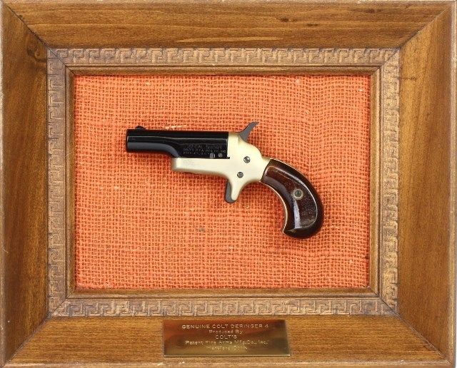 presented to Robert McBride VP Colt Marketing 1963, non functioning Derringer framed and mounted on board, Colts brass plaque attached. Framed 9" X 11". Nice collectable Colt memoribilia straight from the family, consigned by Robert McBrides daughter. Est. 250-500