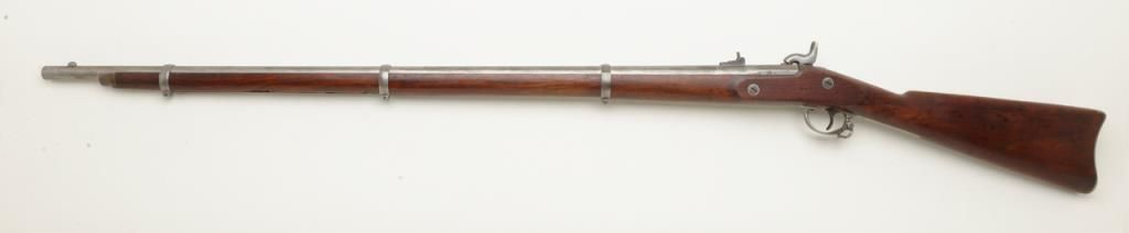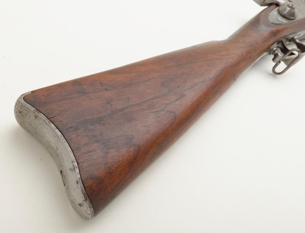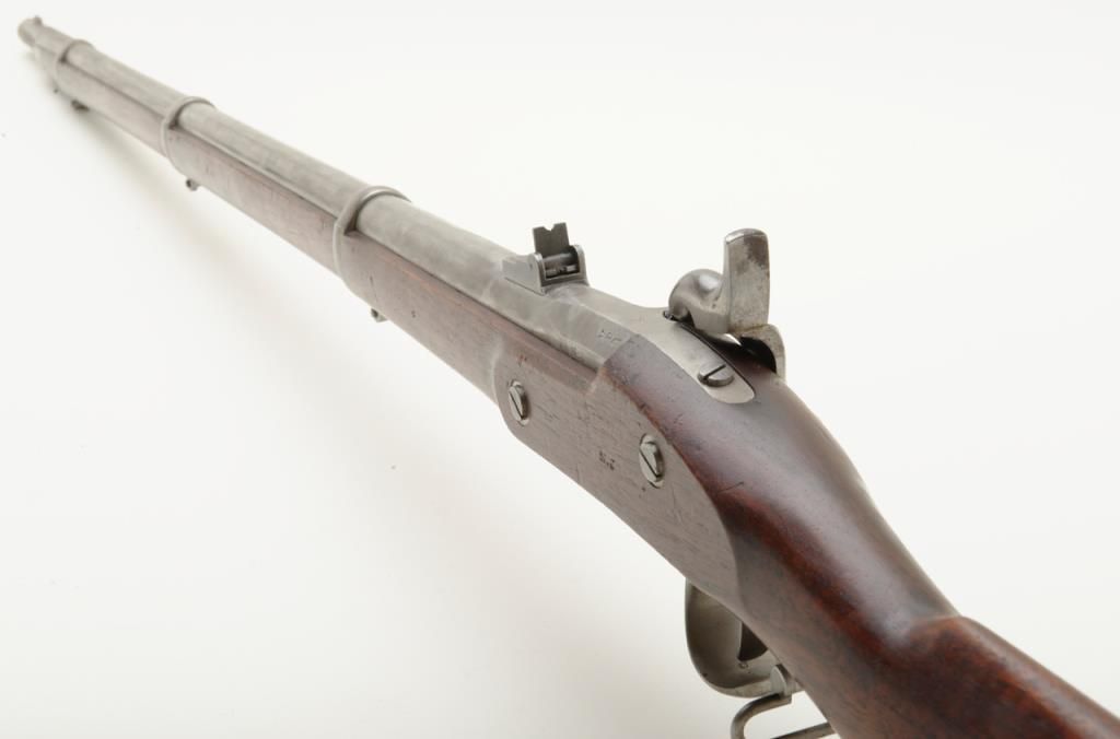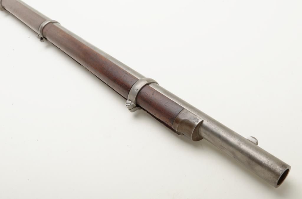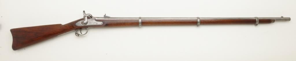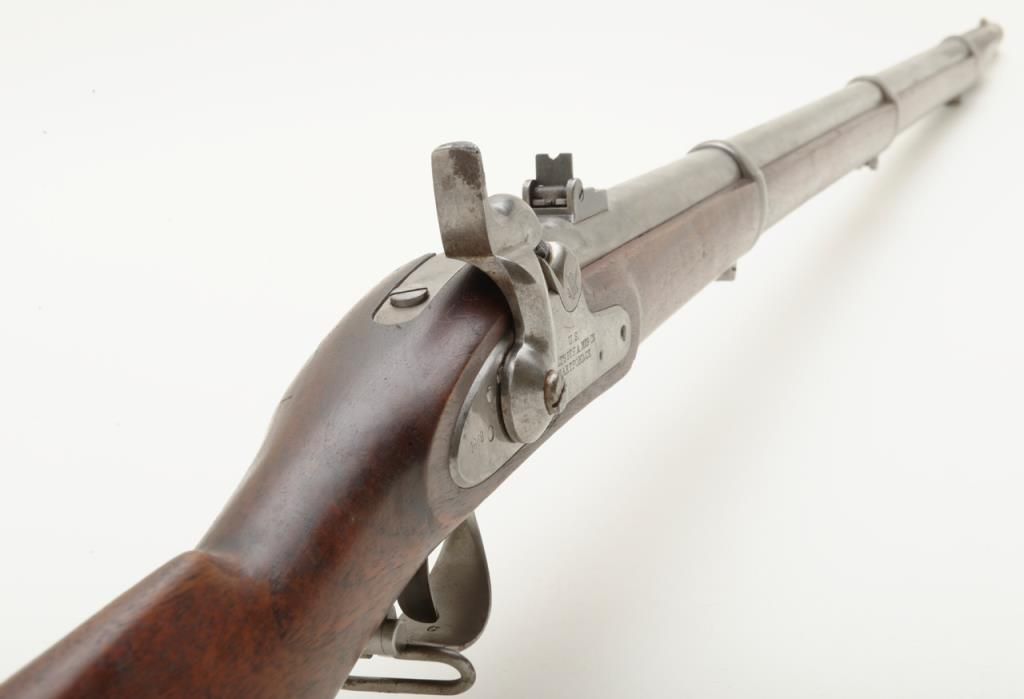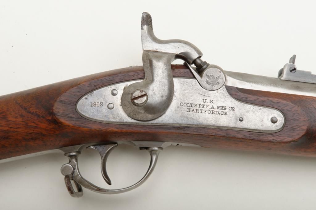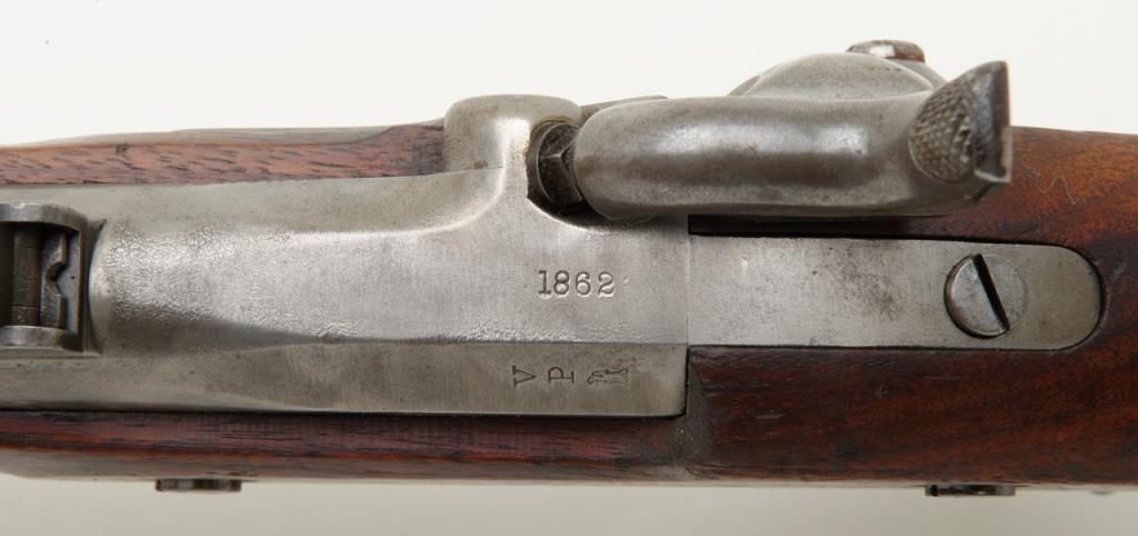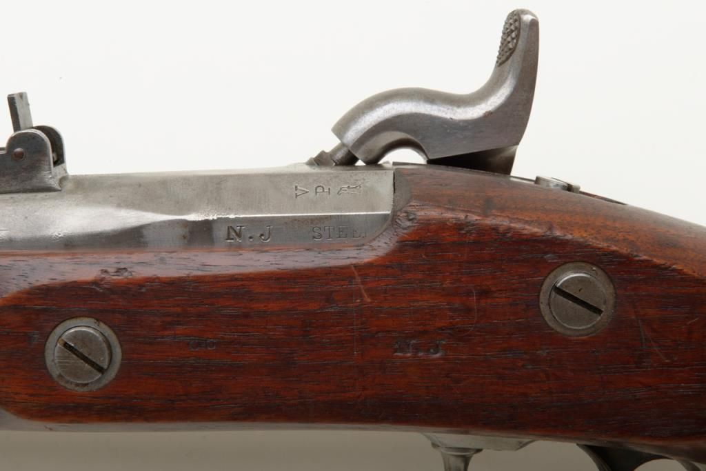 Colt special musket in .58 caliber rifled dated 1862 showing New Jersey markings on breech of barrel and in stock. The rifle remains in very good plus original condition showing bright finish with just some minor erosion and slight pinprick surface pitting. The stock is very good with sharp New Jersey stampings along with inspectors initials O. C. There are some small chips and losses along the ramrod channel but the stock is generally very good plus overall. The rear sight and nipple show considerable original blue finish. The bore is very good plus and still bright with sharp rifling. A 7+ to 8 on a 1 to 10 scale. Est.: $1200-$2400