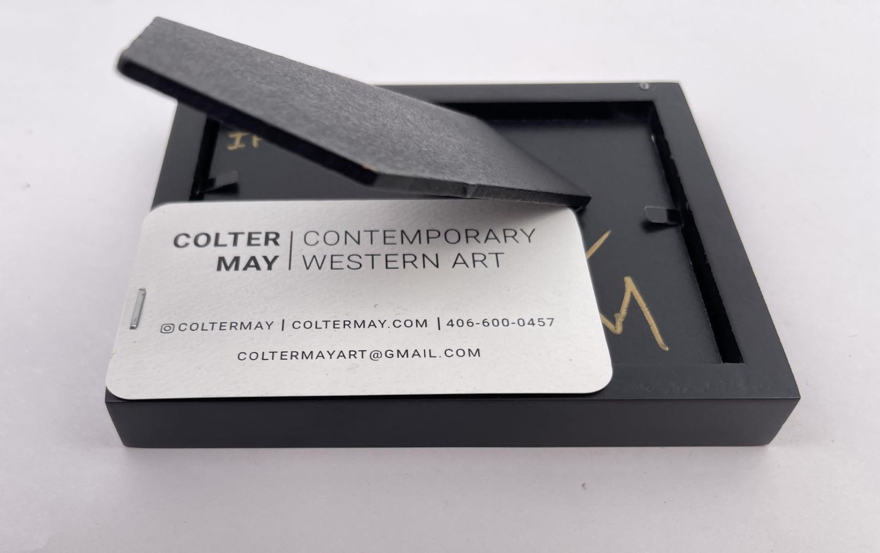 3 3/4" by 4 3/4" framed. Colter was born in Bozeman Montana and raised in a family that valued faith and wholesome activities. From his father, he learned to love the outdoors, respect wildlife, and live with commitment, consistency, and passion. From his mother, he was taught humor, kindness, and the value of finding joy in imagination. These roots provided the fertile beginnings for Colter's drive to become an artist. While the subject of his work primarily focuses on wildlife and landscapes, his ideation and philosophy behind his work are directly influenced by the values he learned and lives in his home. Colter graduated from Brigham Young University-Idaho with a BFA in painting. He lives in Utah with his wife Bobbe and their two daughters Mindy and Emi. EDUCATION 2019 - 2021 B.F.A. Painting, Brigham Young University - Idaho, Rexburg, Idaho 2017-2018 Southern Virginia University, Art Major, Concentration Graphic Design MENTORS Shae Warnick - Painting, Brigham Young University - Idaho Kimball Geisler - Plein Air Brian Astle - Painting, Brigham Young University - Idaho Leon Parson - Painting & Drawing, Brigham Young University - Idaho Barbara Crawford - Painting & Drawing, Southern Virginia University Bryce Pendleton - Design, Southern Virginia University AWARDS 2021 Merit Award, "Prairie Phantom", Animal Competition, Art Show International Third Place Professional "American Icon," Art Grows Rexburg Talent Award, "Last Minute", Color-1, Art Show International Best Artist Under 30, "Last Minute", April Plein Air Salon, Plein Air Magazine Curator's Choice Award, "Blueberry Monday", Idaho Falls Arts Council National Juried Exhibition Merit Award, "Navigating Negative Space", Brigham Young University - Idaho Student Show Merit Award, "Our Shared Symbol", Brigham Young University - Idaho Student Show Best Artist Under 30, "Blueberry Monday", January Plein Air Salon, Plein Air Magazine 2020 Finalist, Camelback Gallery, Abstracts in Gold and Silver First Place Photography, "Grid Iron Glory", Camelback Gallery, Autumn 2020, "Grid Iron Glory" Finalist, "Blueberry Monday', Camelback Gallery, Shades of Red Show First Place Amateur, "Blueberry Monday", Art Grows Rexburg Art Talent Award Scholarship, Brigham Young University - Idaho 2019 Best in Category, Book Arts, "Book of Mormon Art Show" Special Collections & Archives, Brigham Young University - Idaho Reserve Grand Champion, Madison County Fair Cover Award, The Review, Southern Virginia University Publication, Release, Cyanotype 2018 Best in Show, Utah County State Fair, "Pastel Horse" oil pastel People’s Choice Award, Southern Virginia University Student Art Show, "My Fish: Dog" Ink and colored pencil EXHIBITIONS 2021 2nd Annual Business Card Show, JKR Gallery, Provo, Utah 3rd Annual Juried Art Expo, Frame of Mind, Missoula, MT Art Grows Rexburg, Rexburg, Idaho Summit County Arts Showcase, Summit County, Utah April Plein Air Salon, Plein Air Magazine Handscapes, J Kirk Richards Gallery, Provo Utah BFA Senior Showcase, Monarchs of the West, Brigham Young University - Idaho A Walk in the Garten, Brigham Young University - Idaho Student Show Exhibit, Brigham Young University - Idaho Idaho Falls Arts Council National Juried Exhibition, Idaho Falls, Idaho All Shapes and Sizes, JKR Gallery, Provo Utah January Plein Air Salon, Plein Air Magazine Summit County Arts Showcase, Summit County, Utah 2020 Abstracts in Gold and Silver, Camelback Gallery Autumn, Camelback Gallery November Plein Air Salon, Plein Air Magazine Business Card Show, J Kirk Richards Gallery, Provo Utah Spring City Plein Air Competition Shades of Red, Camelback Gallery Art Grows Rexburg, Rexburg Idaho Idaho Arts Council National Juried Exhibition, Idaho Falls, Idaho Winter Fine Arts Show, Yellowstone Teton Gallery, St. Anthony, Idaho Introspection, Yellowstone Teton Gallery, St. Anthony, Idaho 2019 Student Show Exhibit, Brigham Young University - Idaho Art Grows Rexburg, Rexburg Idaho Book of Mormon Art Show, Special Collections & Archives, Brigham Young University - Idaho 2018 Student Art Show, Southern Virginia University