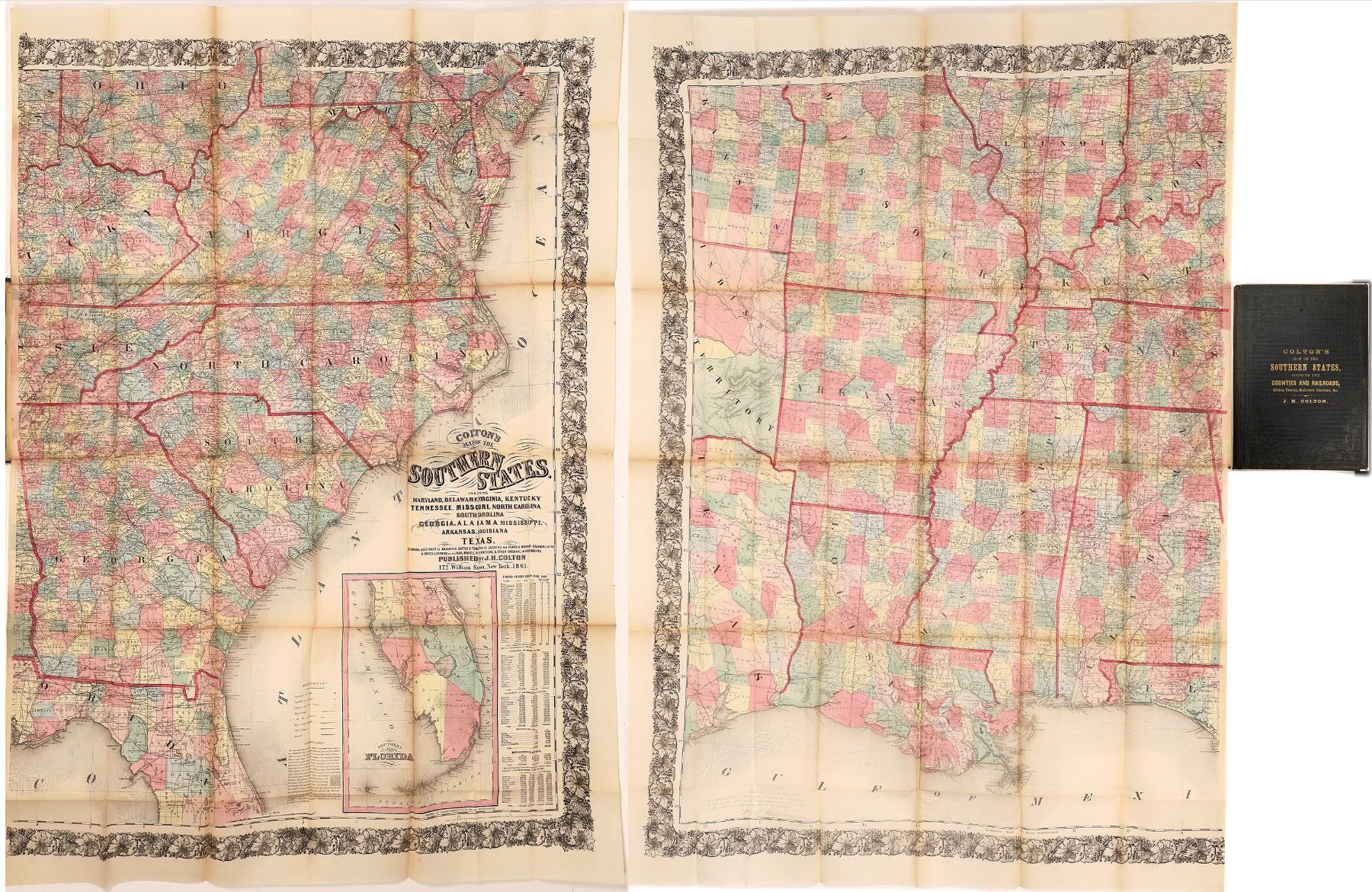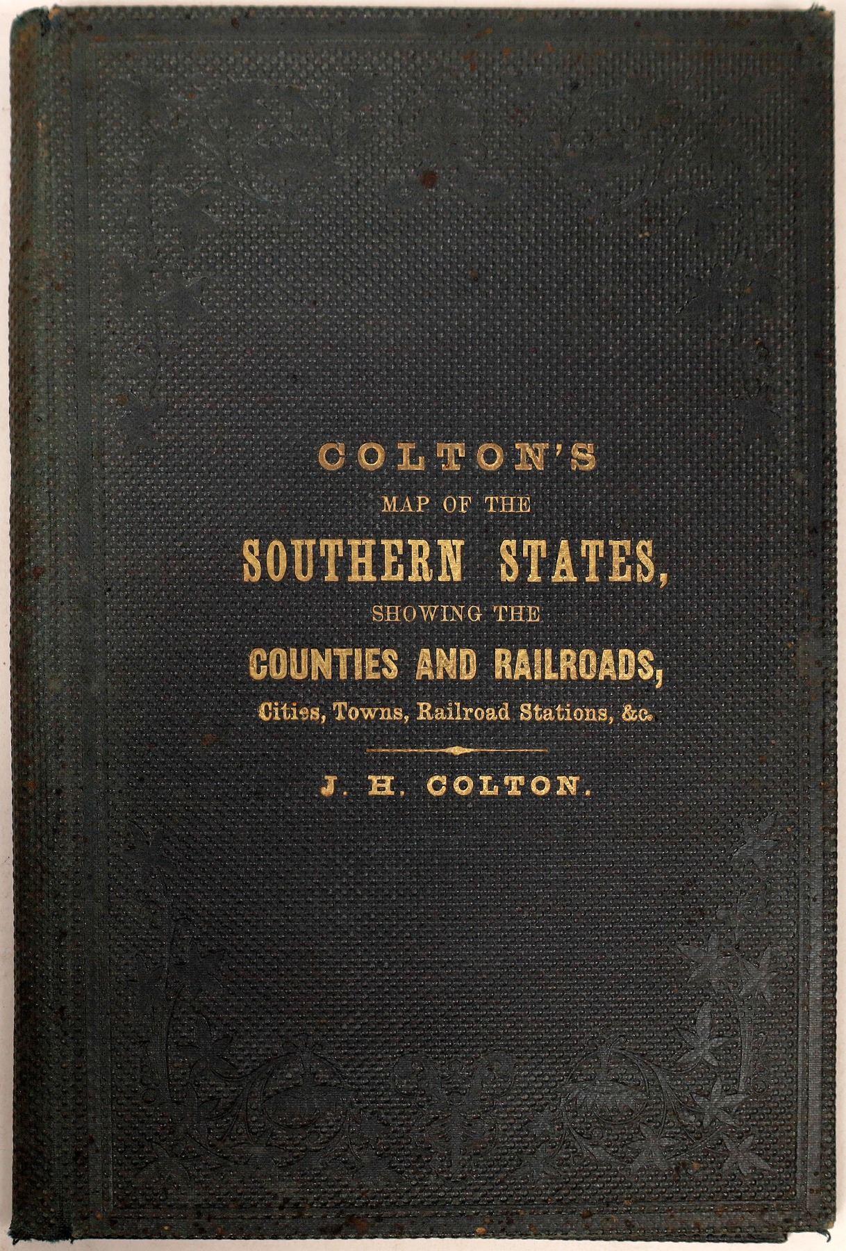 Hardcover, excellent condition edition of Colton's Map of the Southern States, showing the counties and railroads, cities, towns, railroad stations, etc. by J. H. Colton.