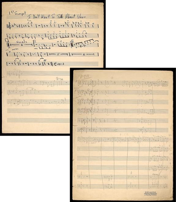 Coltrane Musical Score Unsigned. Autograph musical score unsigned titled "I Don't Want To Talk About You," on both sides of a 12½ x 9½ in. composition sheet. The title and the first five lines are written with black marker, as is "1st Trumpet" at top left. The remainder is written in pencil. Some soiling.