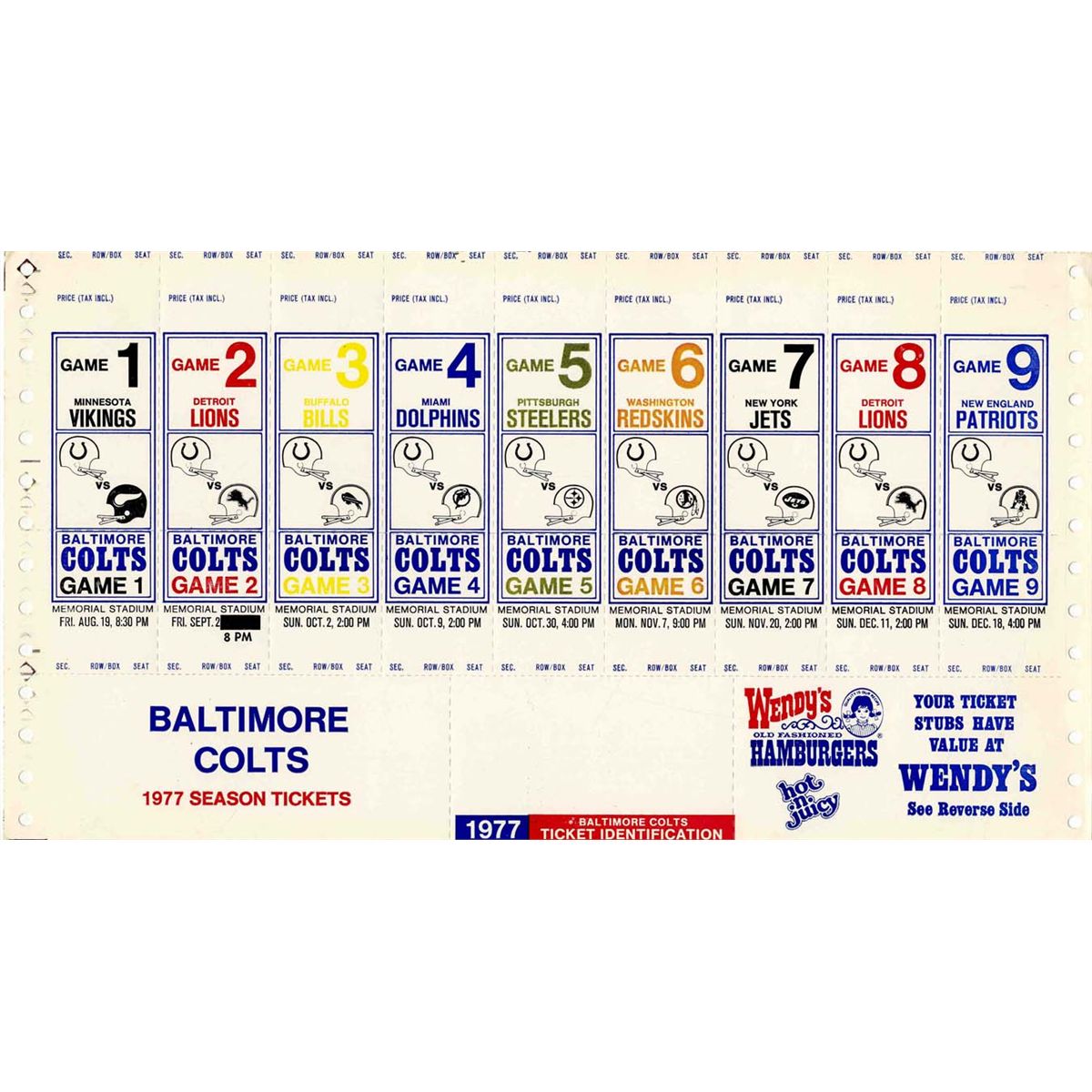 Baltimore Colts 1977 Season Tickets Uncut Sheet -- Measures 14'' x 7'' -- Exact Seating Not Determined -- Overall Near Fine