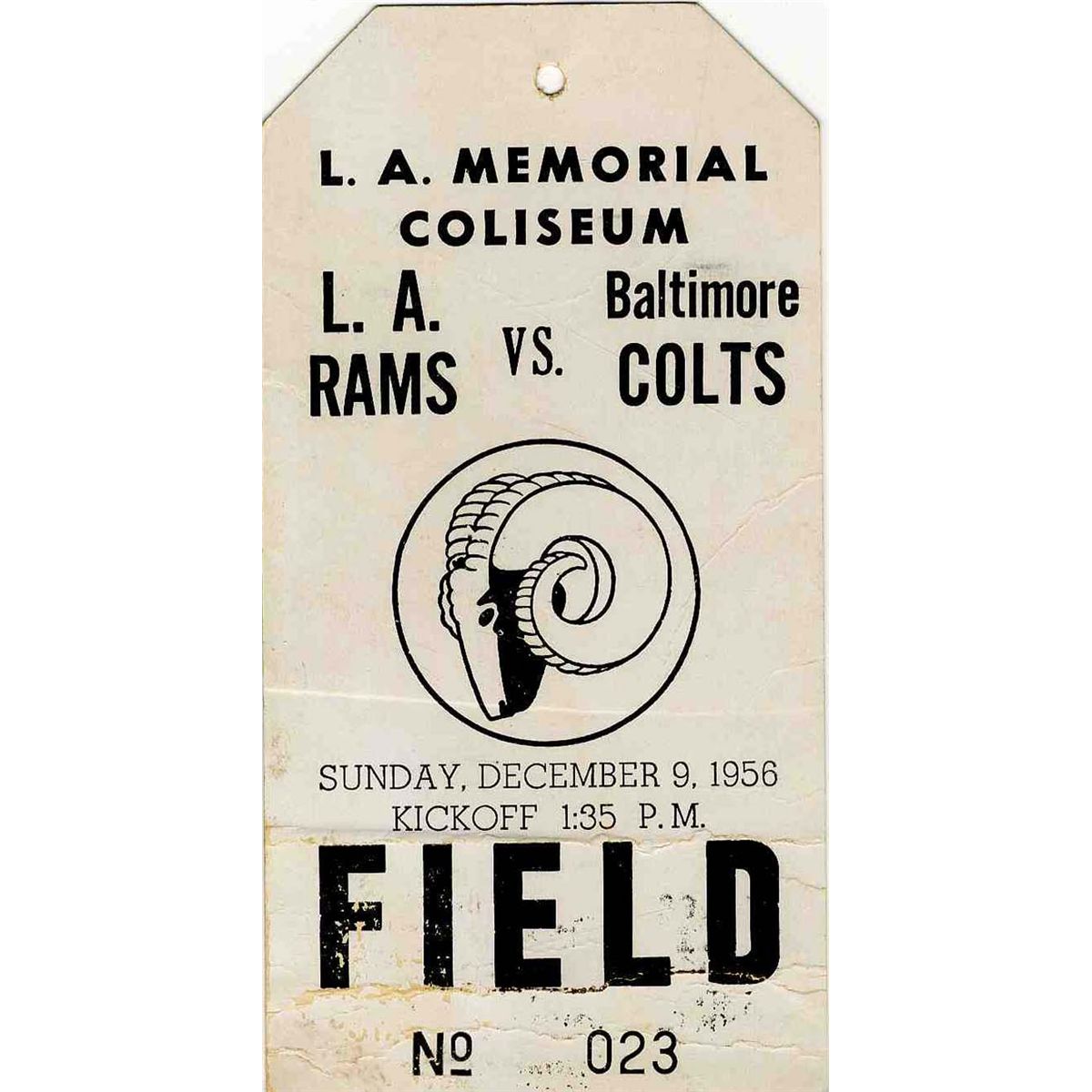 Baltimore Colts vs. Los Angeles Rams 1956 Field Pass -- L.A. Coliseum -- 2.25'' x 4.5'' -- Minor Creasing, Very Good