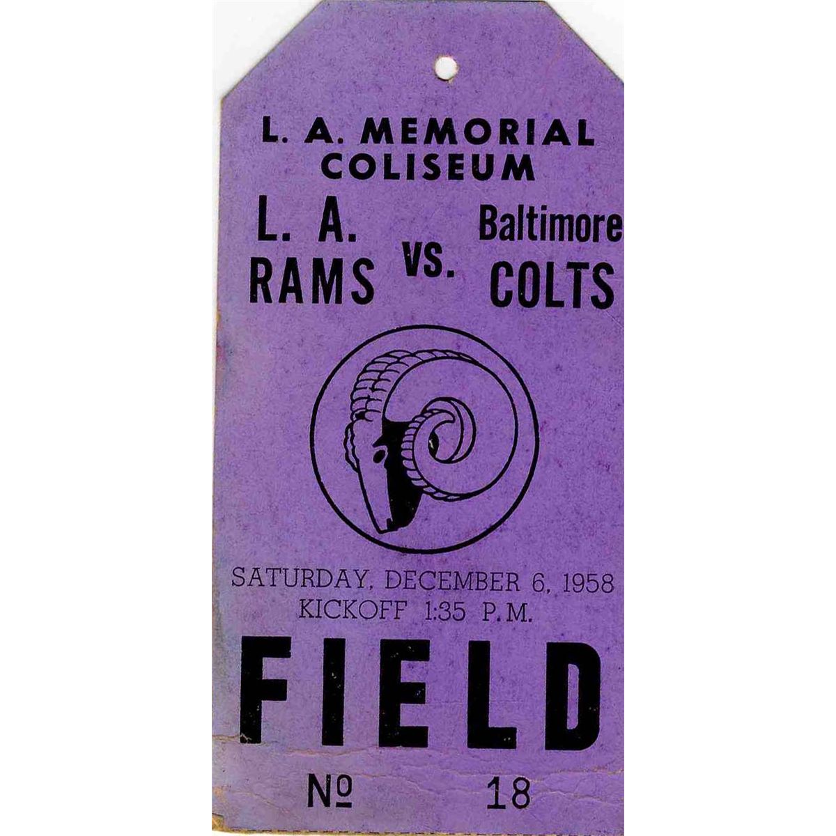 Baltimore Colts vs. Los Angeles Rams 1958 Field Pass -- L.A. Coliseum -- 2.25'' x 4.5'' -- Very Good