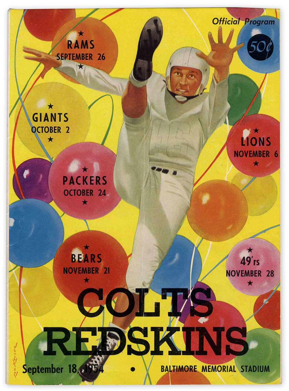 Colts vs. Redskins program from 1954. Program runs 46pp. Measures 7.75'' x 10.5''. Very good.