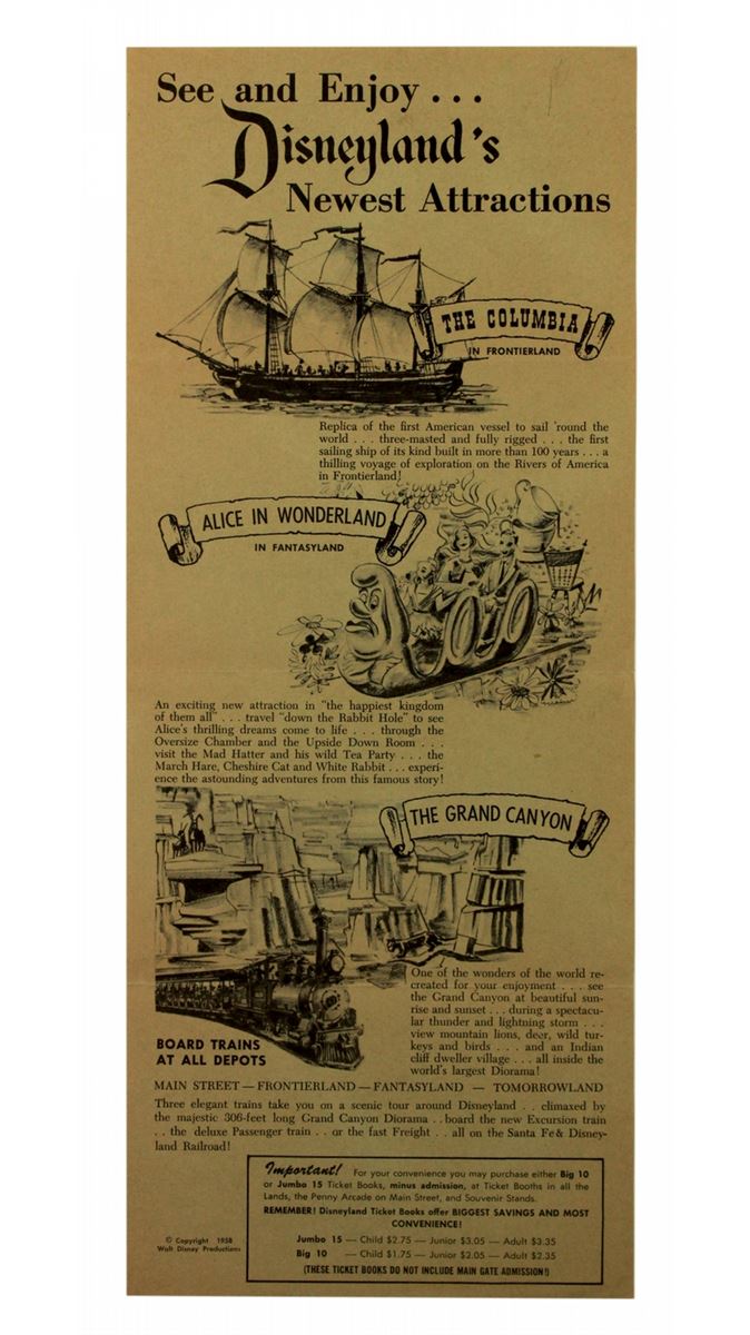 (Disneyland, 1958) Very rare gate flyer featuring the Columbia Sailing Ship and Alice in Wonderland attractions. Measuring 12 x 5 in. .n very good condition.