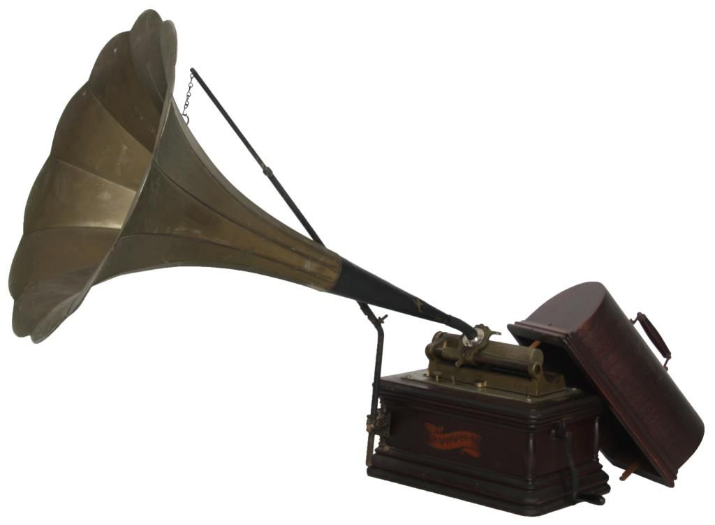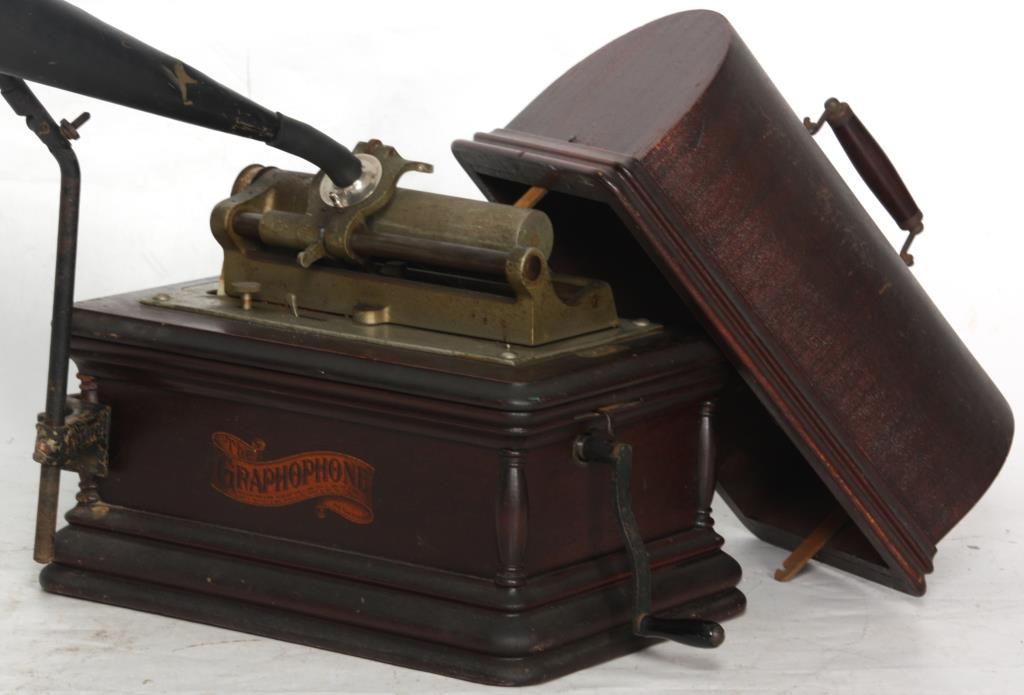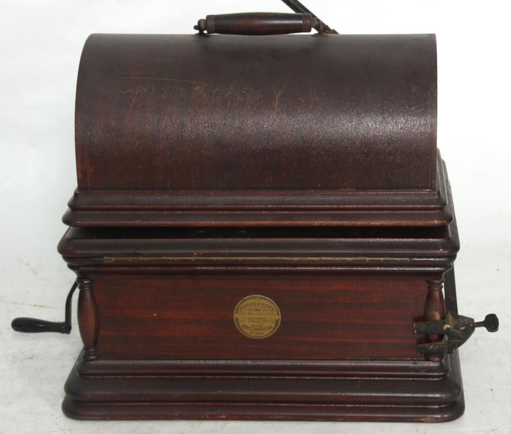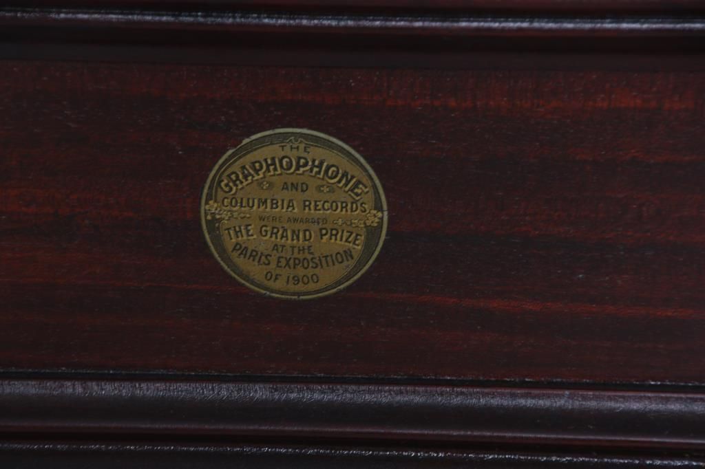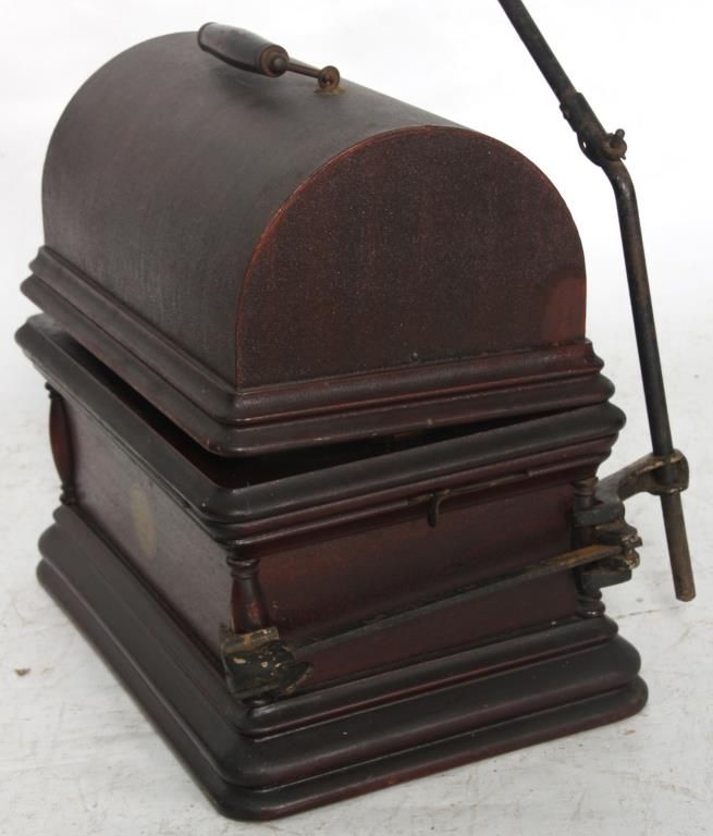 Columbia Cylinder Graphophone w/ Horn & Crane. The mahogany case has turned corner columns and domed lid, “The Graphophone” banner decal on the front and “Grand Prize at the Paris Exhibition, 1900” decal on the rear. Has an iron, side mounted crane with 13 panel nickel horn having a scalloped rim and measuring 32 in. long x 24 in. dia. Spring driven mechanism with 6.5 in. long cylinder, iron chassis has a nickel finish and plays through a lyre shaped reproducer. In overall good condition, Case finish is good original but is dirty and in need of cleaning. 25 in. high x 17 in. wide x 11 in. deep