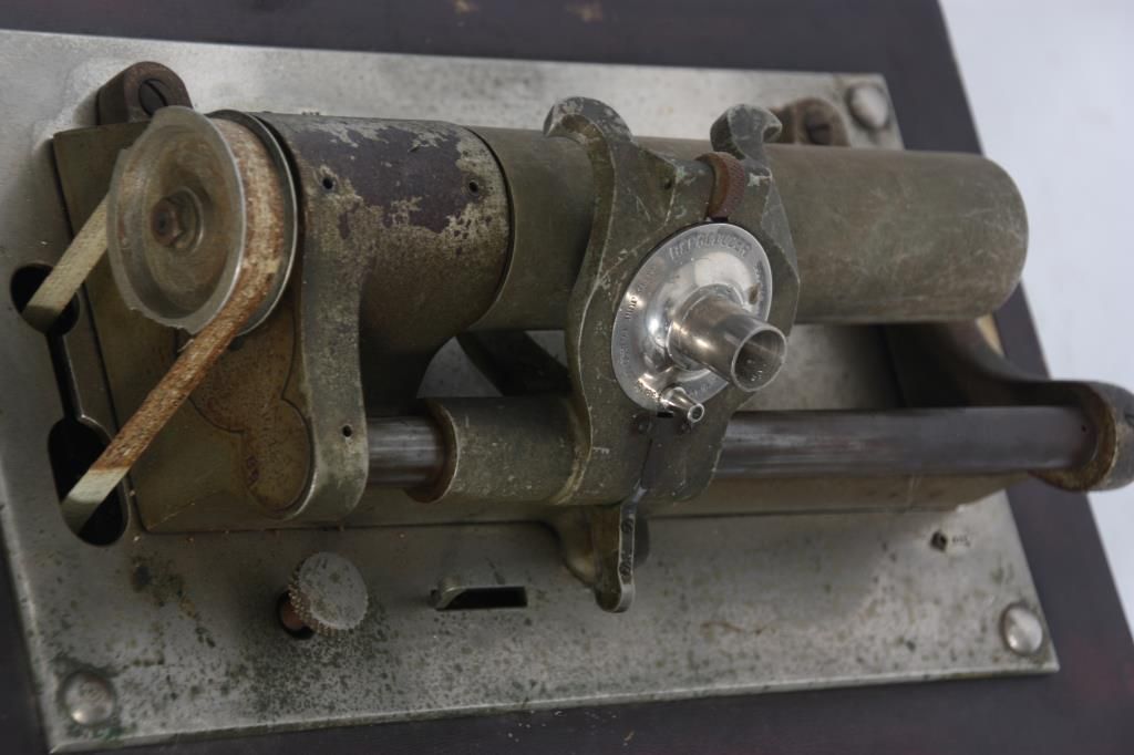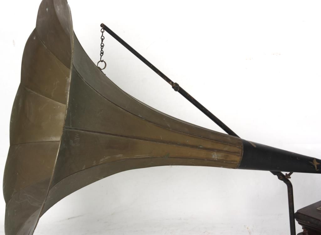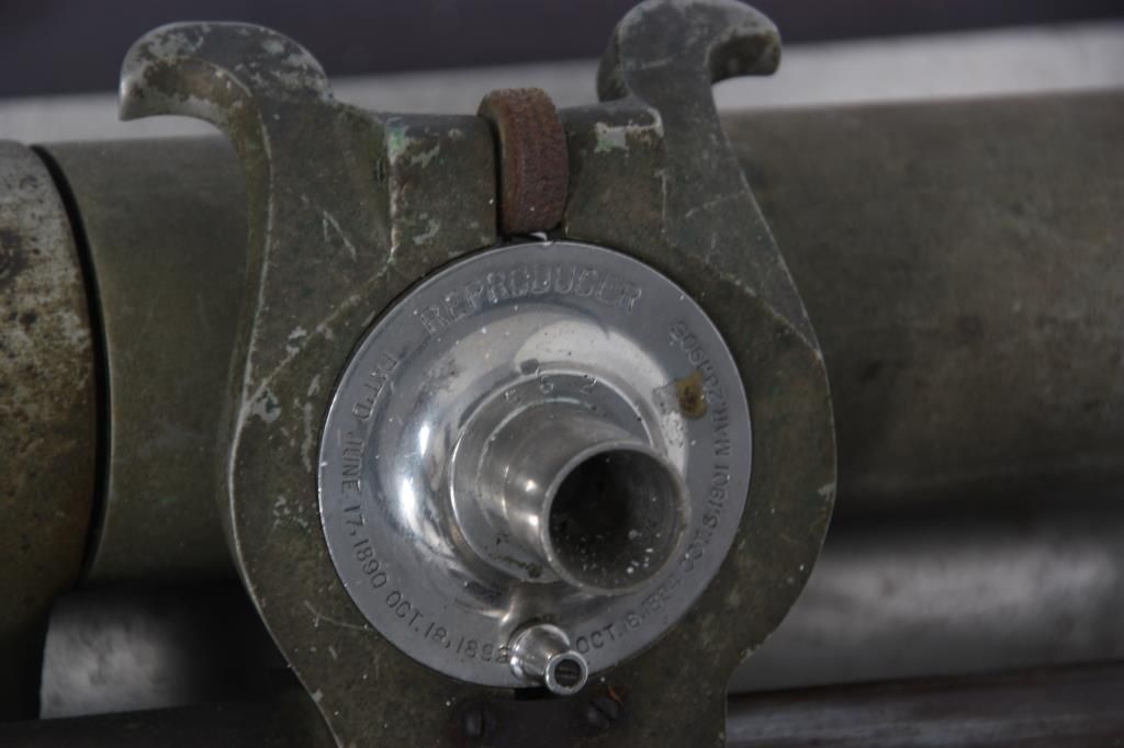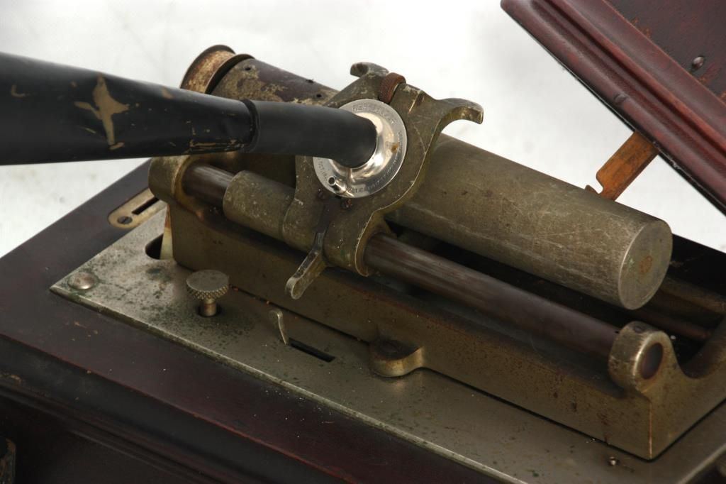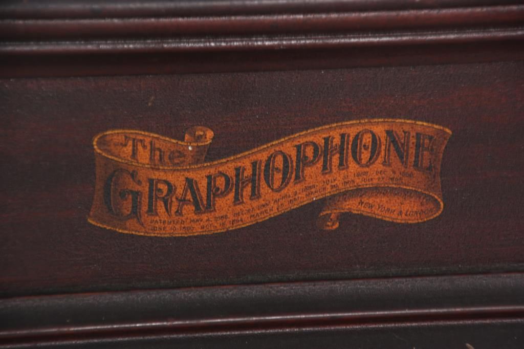 Columbia Cylinder Graphophone w/ Horn & Crane. The mahogany case has turned corner columns and domed lid, “The Graphophone” banner decal on the front and “Grand Prize at the Paris Exhibition, 1900” decal on the rear. Has an iron, side mounted crane with 13 panel nickel horn having a scalloped rim and measuring 32 in. long x 24 in. dia. Spring driven mechanism with 6.5 in. long cylinder, iron chassis has a nickel finish and plays through a lyre shaped reproducer. In overall good condition, Case finish is good original but is dirty and in need of cleaning. 25 in. high x 17 in. wide x 11 in. deep