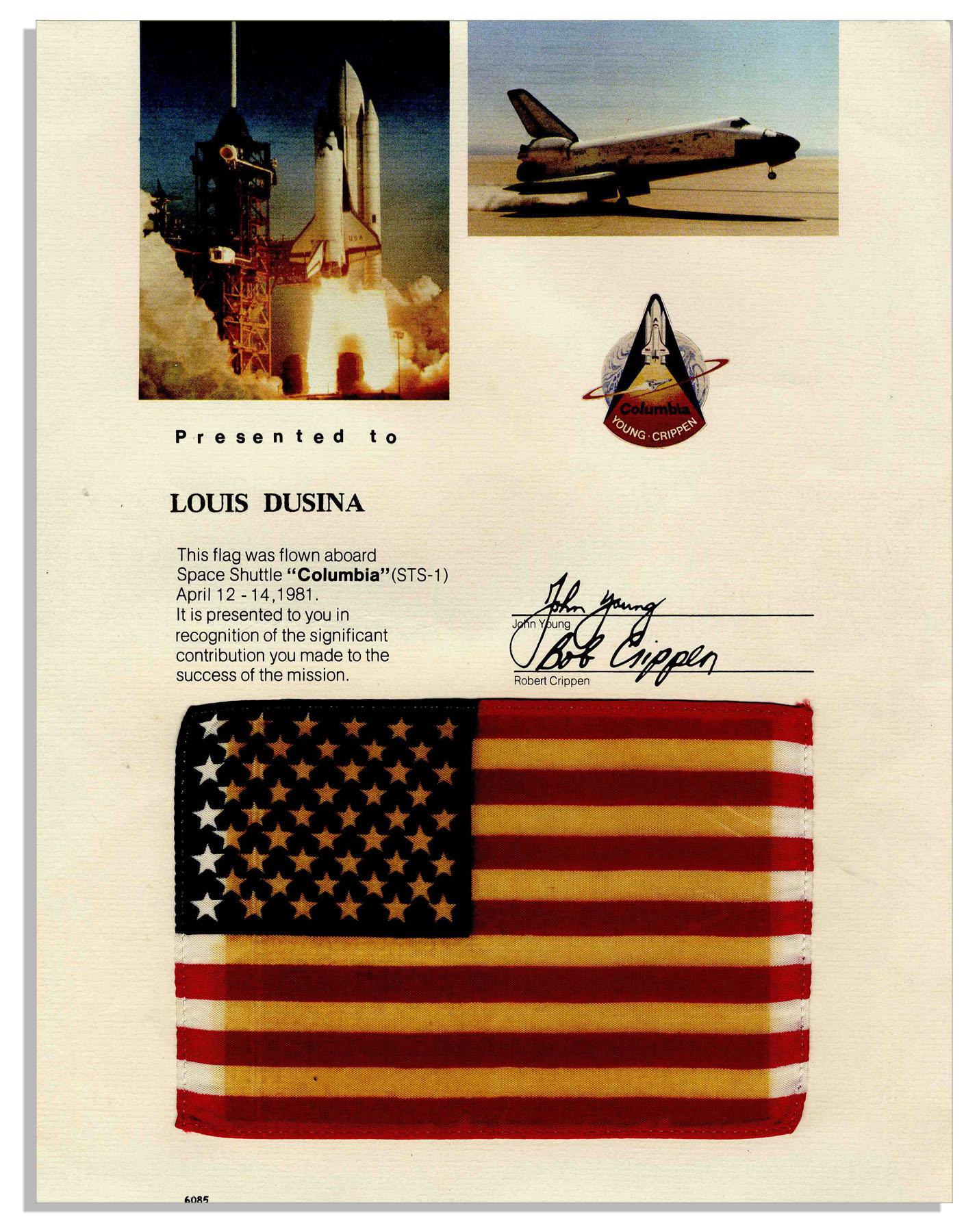 Rare American flag flown on the Columbia (STS-1) space shuttle during the first U.S. orbital mission, which took place on 12-14 April 1981. Flag measures 6'' x 4'' on light rayon type fabric. Colors remain bright but have shrowthrough of glue from mounting. Accompanied by a NASA 11'' x 8.5'' color presentation card addressed to Louis Dusina, with printed signatures of John Young and Robert Crippen, reading in part, ''This flag was aboard Space Shuttle 'Columbia' (STS-1) April 12-14, 1981…'' Near fine condition.