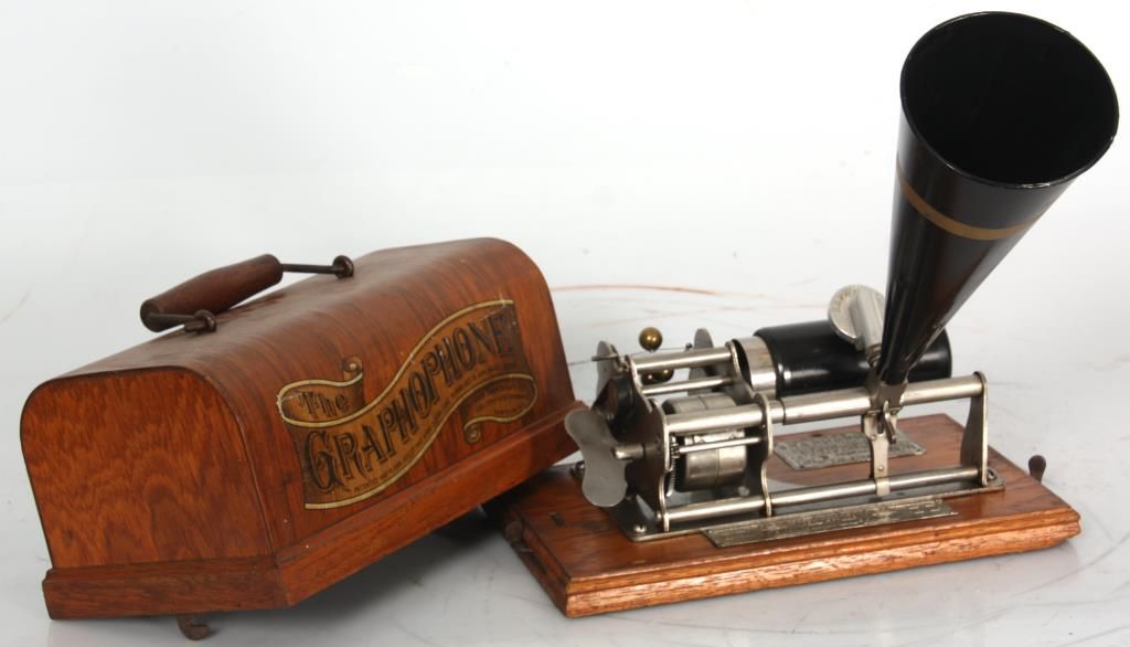 Columbia Graphophone Type-B Phonograph. Oak case and base with domical lid and turned handle; has a skeletonized mechanism with brass spheres on the governor, threaded butterfly key, and conical horn, repainted black with a gold strip, horn measures 10 in. high x 4 in. dia. Metal tag on the platform reads “by the American Graphophone Company”, Type B and serial number 134791. Case measures 6.5 in. high x 11.5 in. wide x 5.5 in. deep.