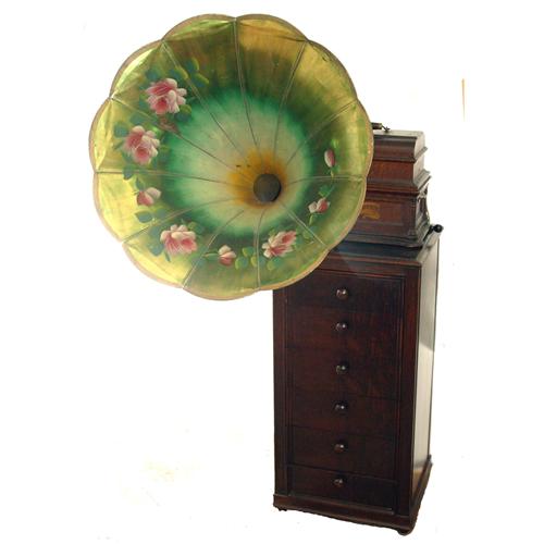Columbia Graphophone - Green Horn. Oak case with nice decal front and back.  Some minor damage where foot has been attached. Gracefully curved base.  Unrestored condition.. Morning glory horn in shades of green with pink floral.  Horn shows wear commensurate with age.  Stand not included.
