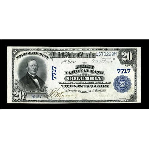 <B>Columbia, IL</B></I> - $20 1902 Plain Back Fr. 650 <B>The First NB</B></I> Ch. # 7717<BR>The pleasing paper here boasts bold embossing and perfectly printed devices. As the only <B>Choice Crisp Uncirculated</B></I> it is perhaps the finest known.<BR><I>From The Lincoln Collection</B></I><BR><BR><b>Shipping:</b> Coins & Currency (<a target="_blank" href="http://www.heritageauctions.com/common/shipping.php">view shipping information</a>)