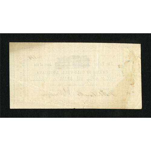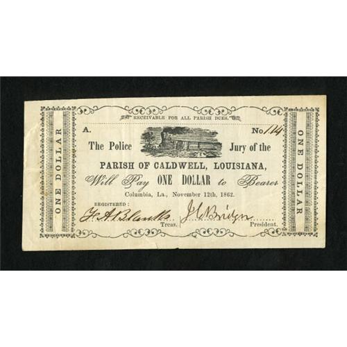 <B>Columbia, LA- Parish of Caldwell </B></I>$1 Nov. 12, 1862 <BR> A similar piece issued by the Parish of Caldwell appeared in our January auction and realized over $600. This piece is a touch better with far nicer paper quality. <B>Very Fine.</B></I><BR><I>From The Collection of a Louisiana Gentleman</B></I><BR><BR><b>Shipping:</b> Coins & Currency (<a target="_blank" href="http://www.heritageauctions.com/common/shipping.php">view shipping information</a>)