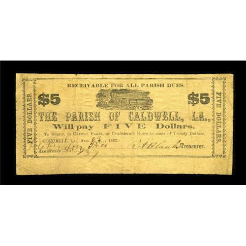 <B>Columbia, LA- Parish of Caldwell</B></I> $5 Aug. 23, 1862<BR> A much scarcer issue from this Parish that was not in the hoard from here that surfaced several years ago. <B>Fine-Very Fine,</B></I> printed on brown paper. <BR><I>From The Collection of a Louisiana Gentleman.</B></I><BR><BR><b>Shipping:</b> Coins & Currency (<a target="_blank" href="http://www.heritageauctions.com/common/shipping.php">view shipping information</a>)