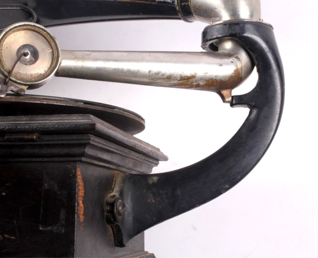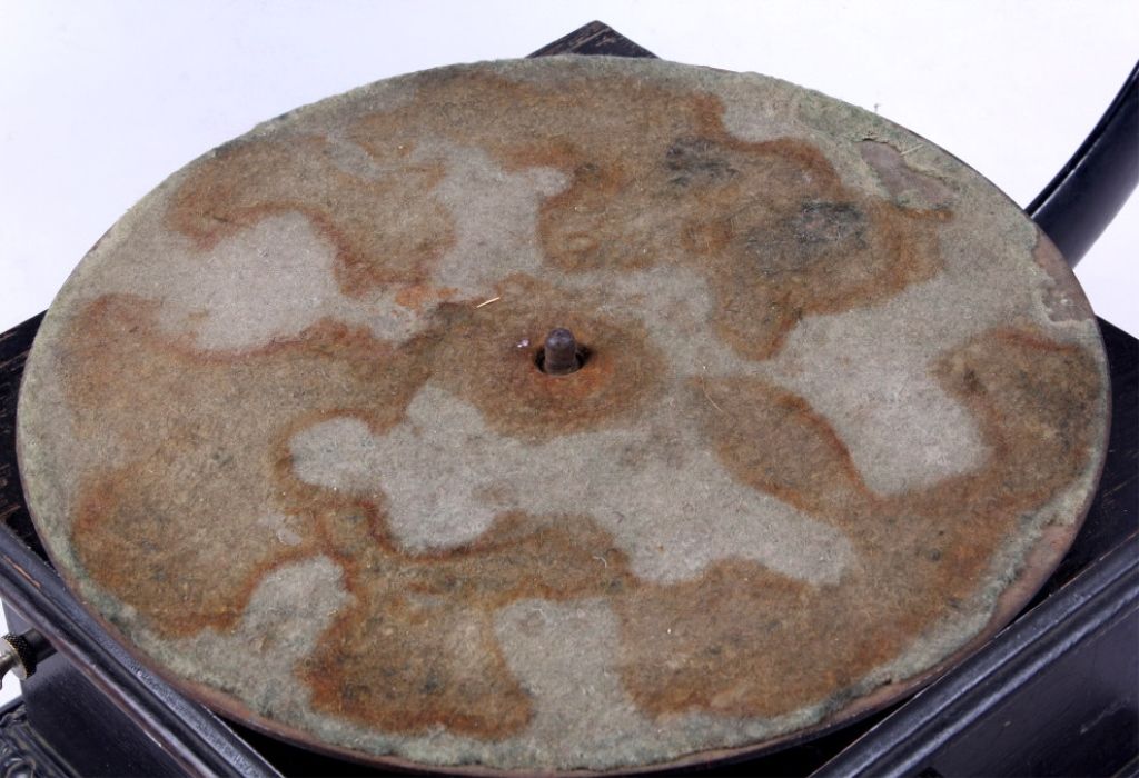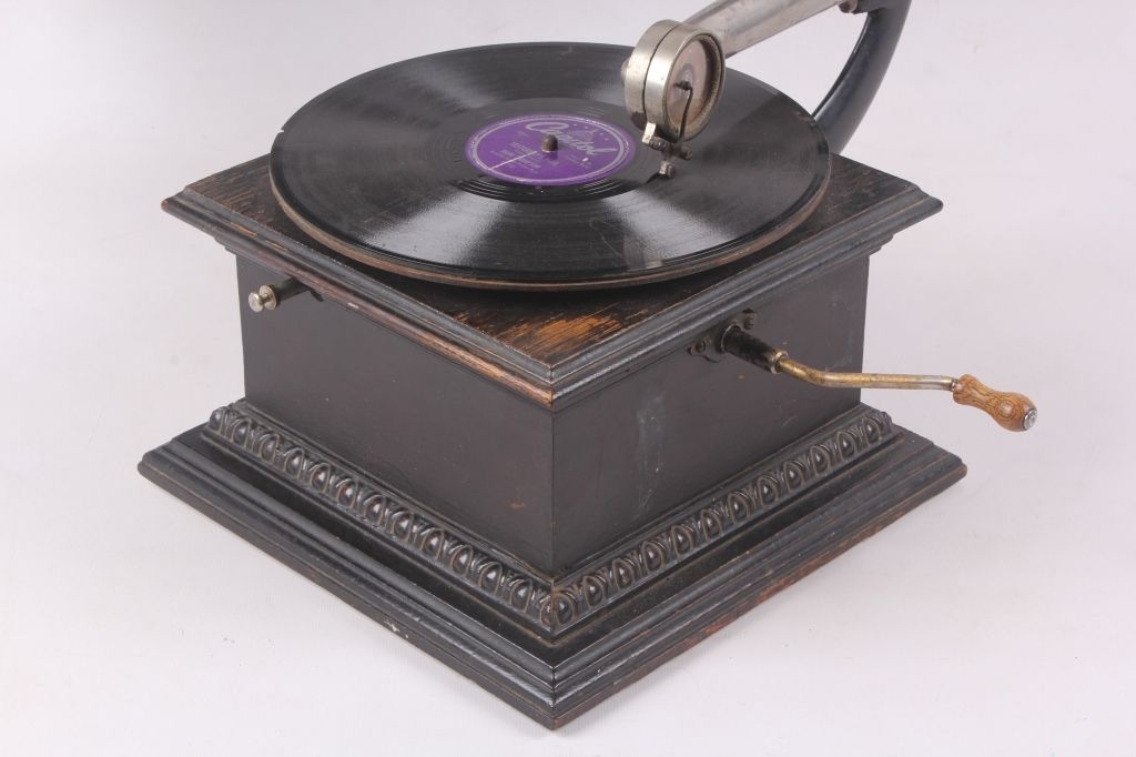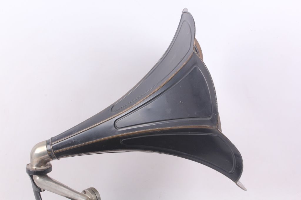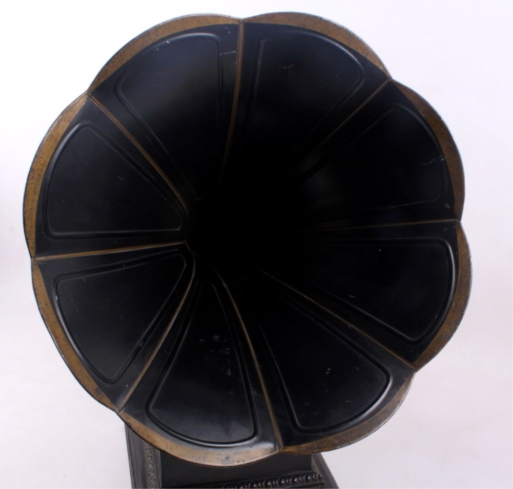 This lot features a unique Columbia model B phonograph with horn. It shows a patent date of Aug. 13, 1901 and does have the original finish. Measures 25.5" tall with horn. The horn is 19" in diameter. Without the horn andhandle, the phonograph measures 11.25" x 15.5" x 12.5".