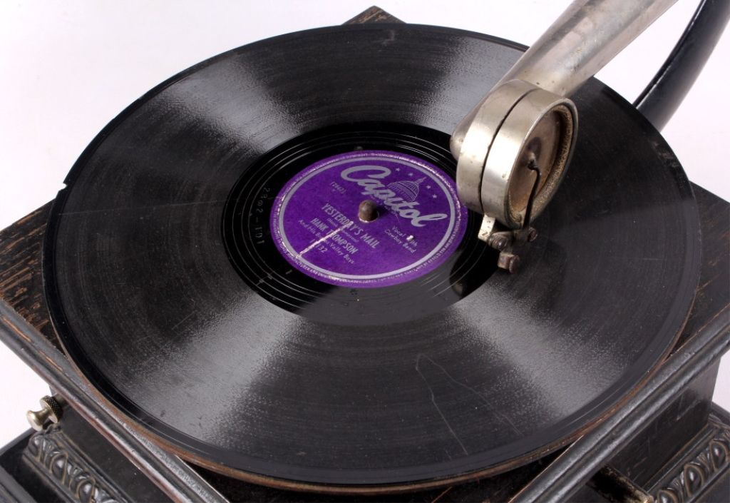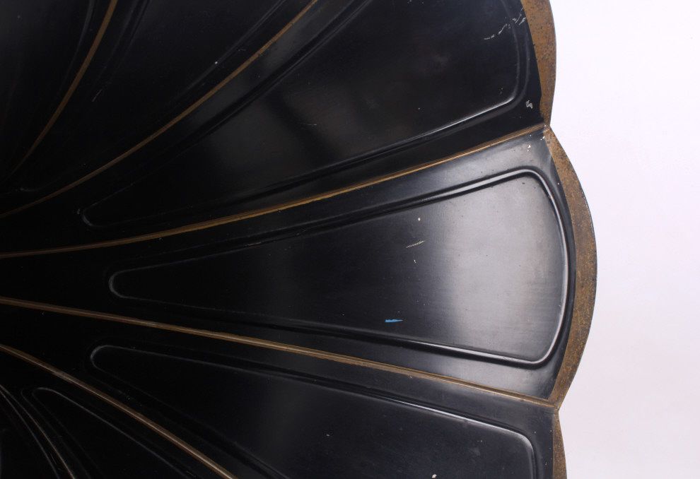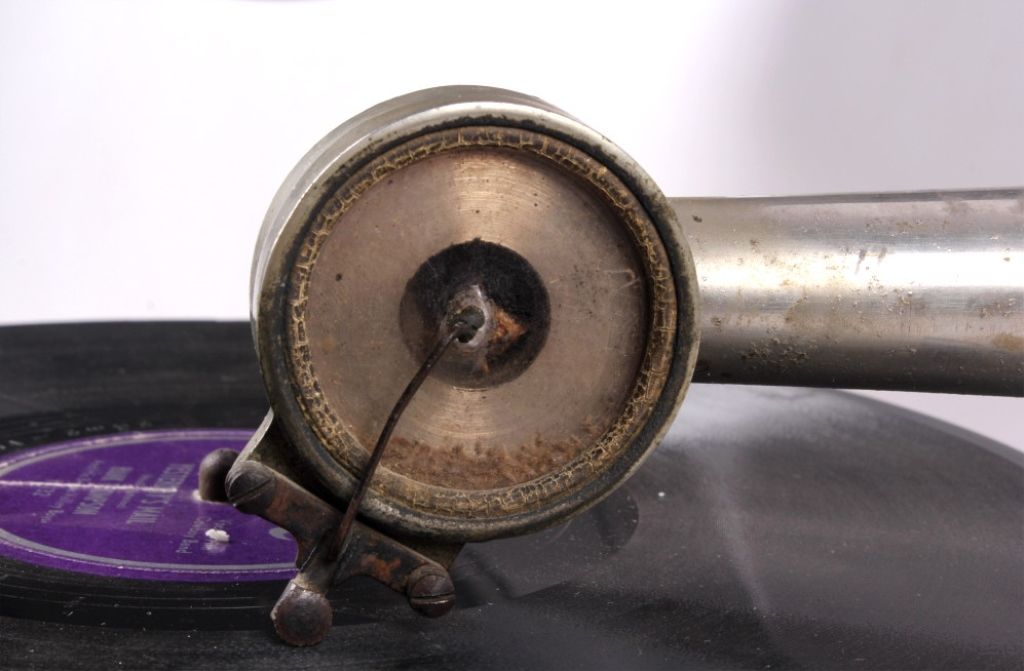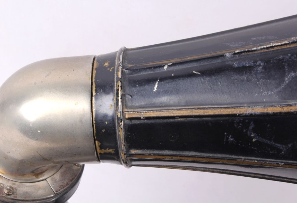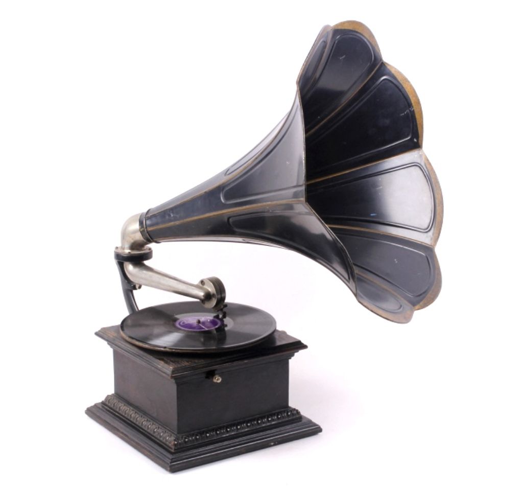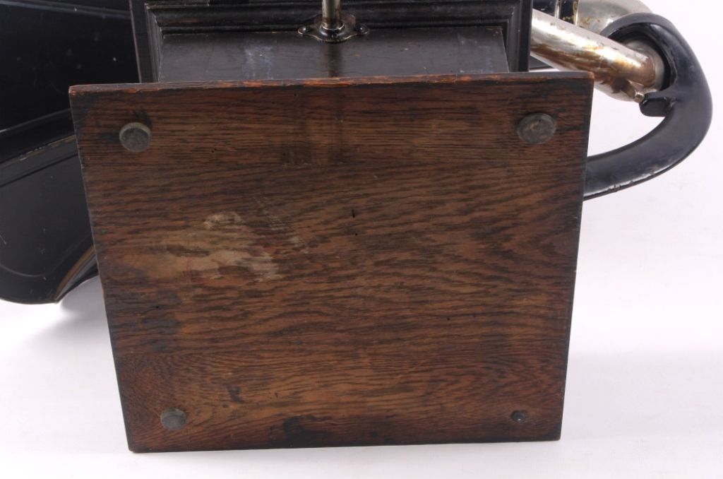 This lot features a unique Columbia model B phonograph with horn. It shows a patent date of Aug. 13, 1901 and does have the original finish. Measures 25.5" tall with horn. The horn is 19" in diameter. Without the horn andhandle, the phonograph measures 11.25" x 15.5" x 12.5".